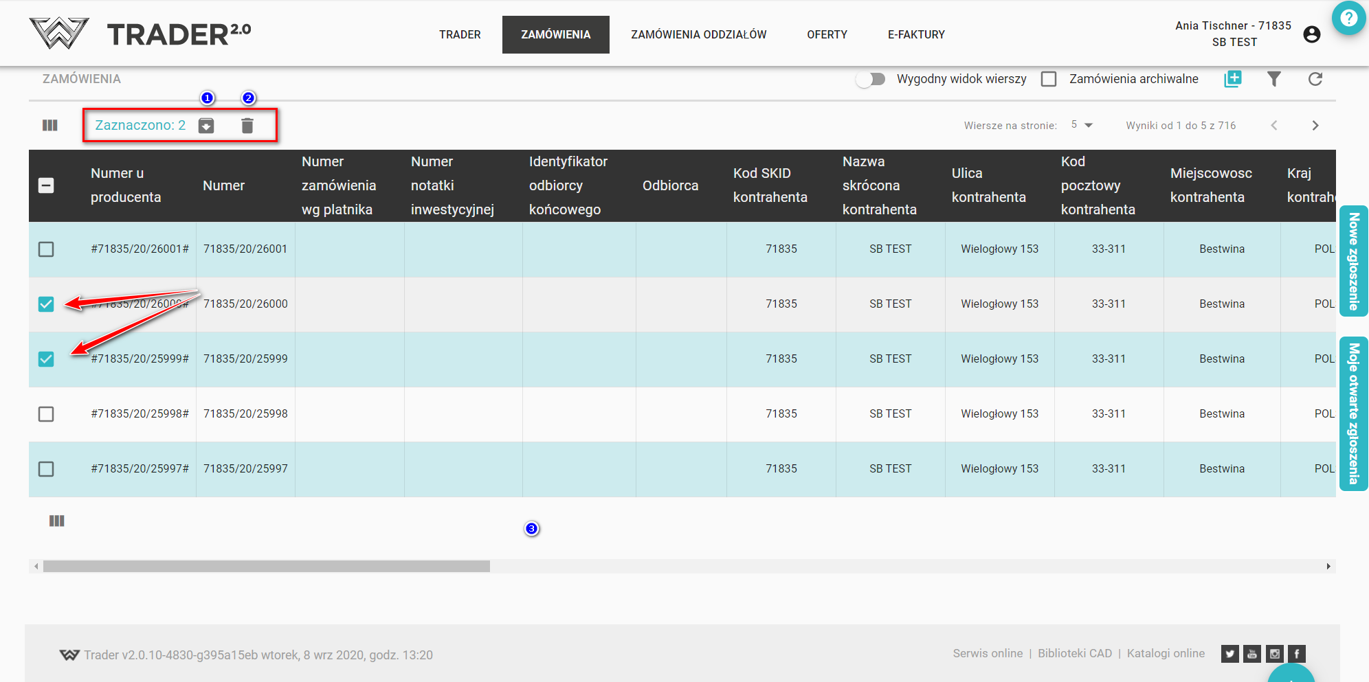 Istnieje również opcja zaznaczania/odznaczania jednej lub wielu pozycji, wówczas aktywne stają się opcje 'Archiwizuj' (1) oraz 'Usuń' (2) (uwaga! checkbox główny nie zaznacza wszystkich, jednak zaznacza max 200 pozycji)
