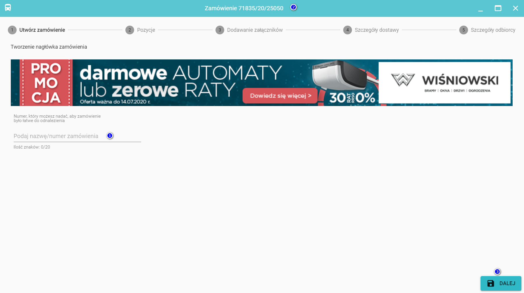 Nagłówek zamówienia - w tym kroku możesz wprowadzić swój numer zamówienia (1), który będzie widoczny również na belce górnej (2) - kiedy to zrobisz kliknij Dalej (3)