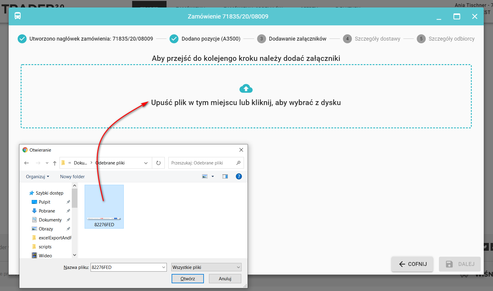 Aby dodać załącznik będąc na etapie dodawania załączników wskaż plik z dysku swojego komputera lub po prostu go przeciągnij.
