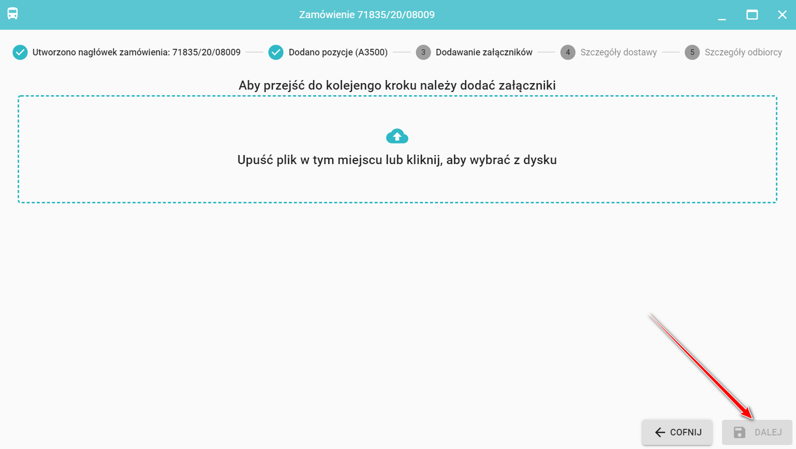 Przycisk Dalej będzie nieaktywny do momentu wybrania załącznika!