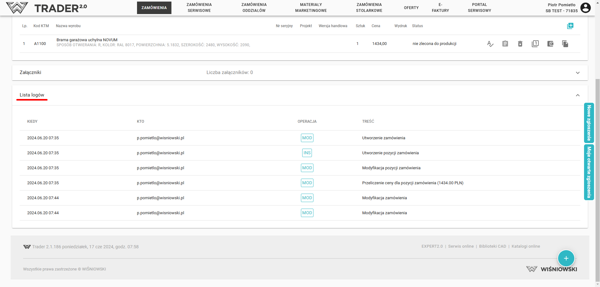 Dla każdego zamówienia istnieje możliwość sprawdzenia jego historii zmian. Wystarczy, że po otwarciu zamówienia przejdziesz do zakładki Lista logów