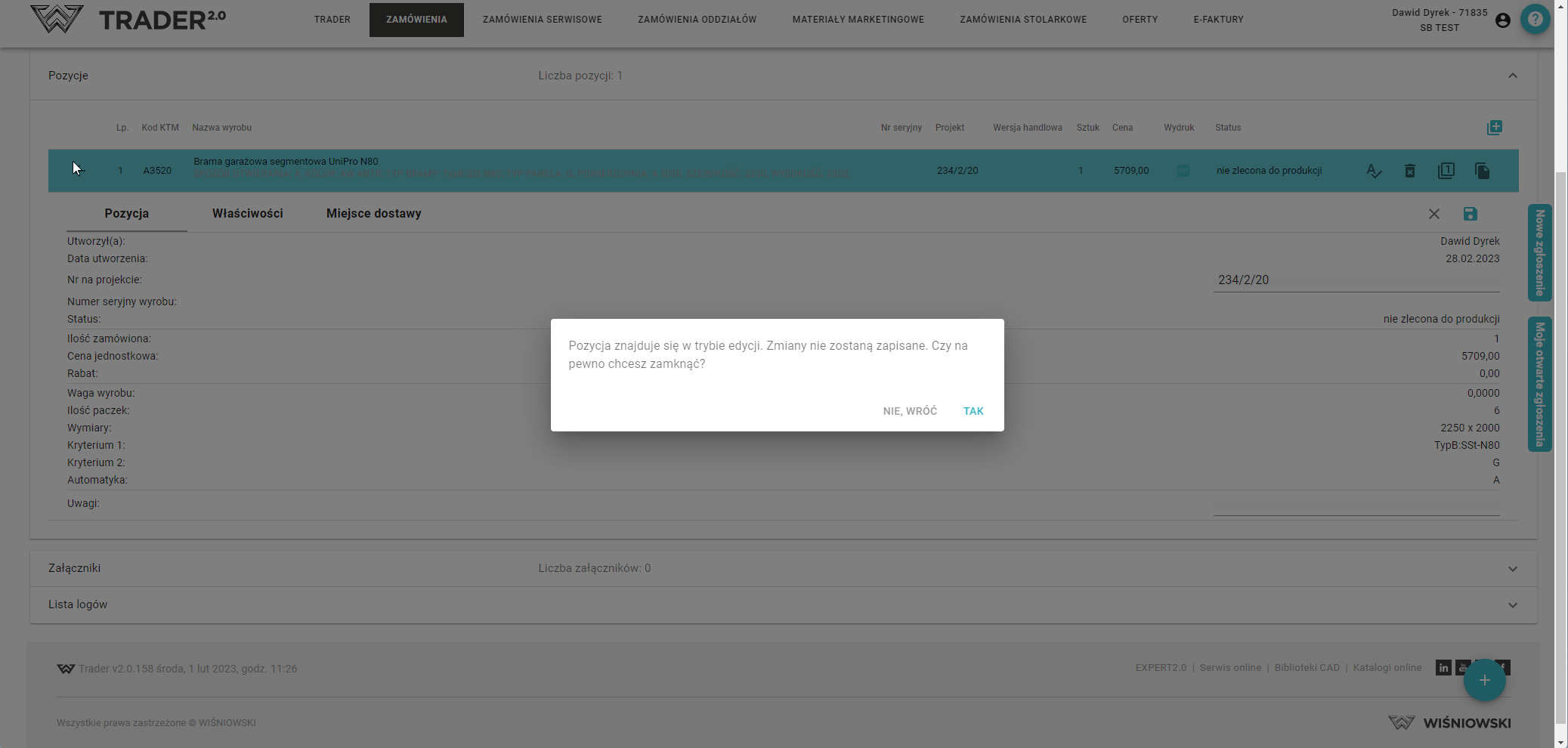 - w Pozycji możesz edytować numer na projekcie oraz dodać uwagi do pozycji.