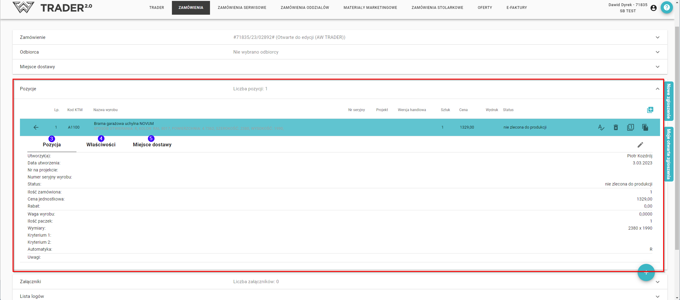 Pozycje: lista dodanych wyrobów, po kliknięciu w dany wyrób wyświetli się możliwość edycji danej pozycji (3), właściwości (4), miejsca dostawy (5)
