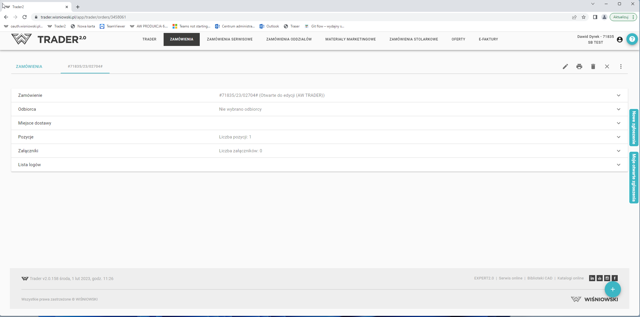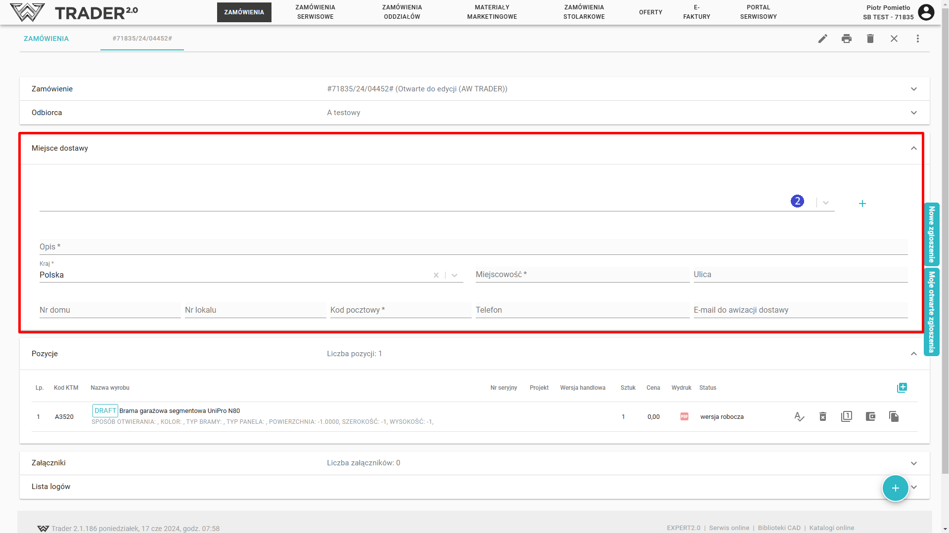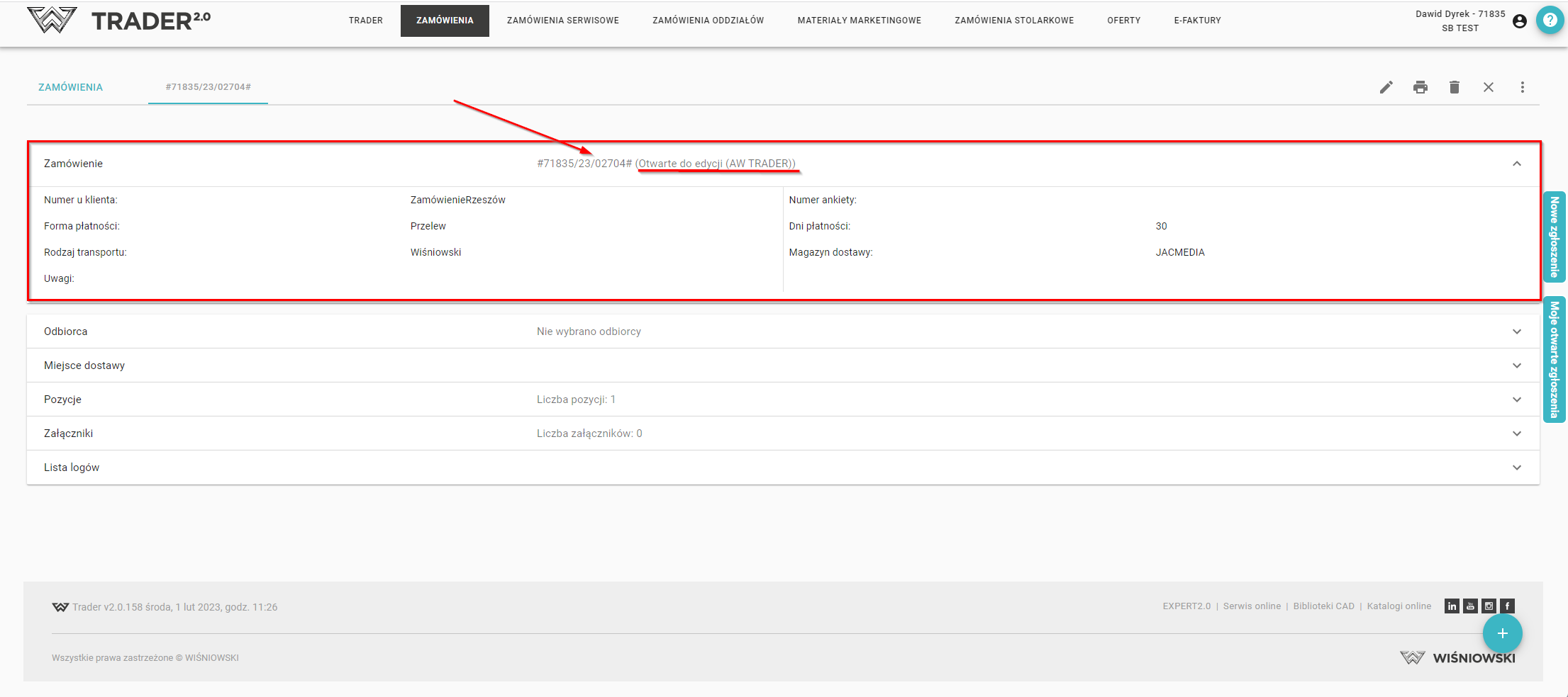 Zamówienie: odnajdziesz tutaj podstawowe informacje tj. numer zamówienia wraz ze statusem (np. "Otwarte do edycji"), numer u klienta, forma płatności, rodzaj transportu, uwagi, numer ankiety, dni płatności, czy magazyn dostawy - jest on wymagany dla wysyłki zamówienia.