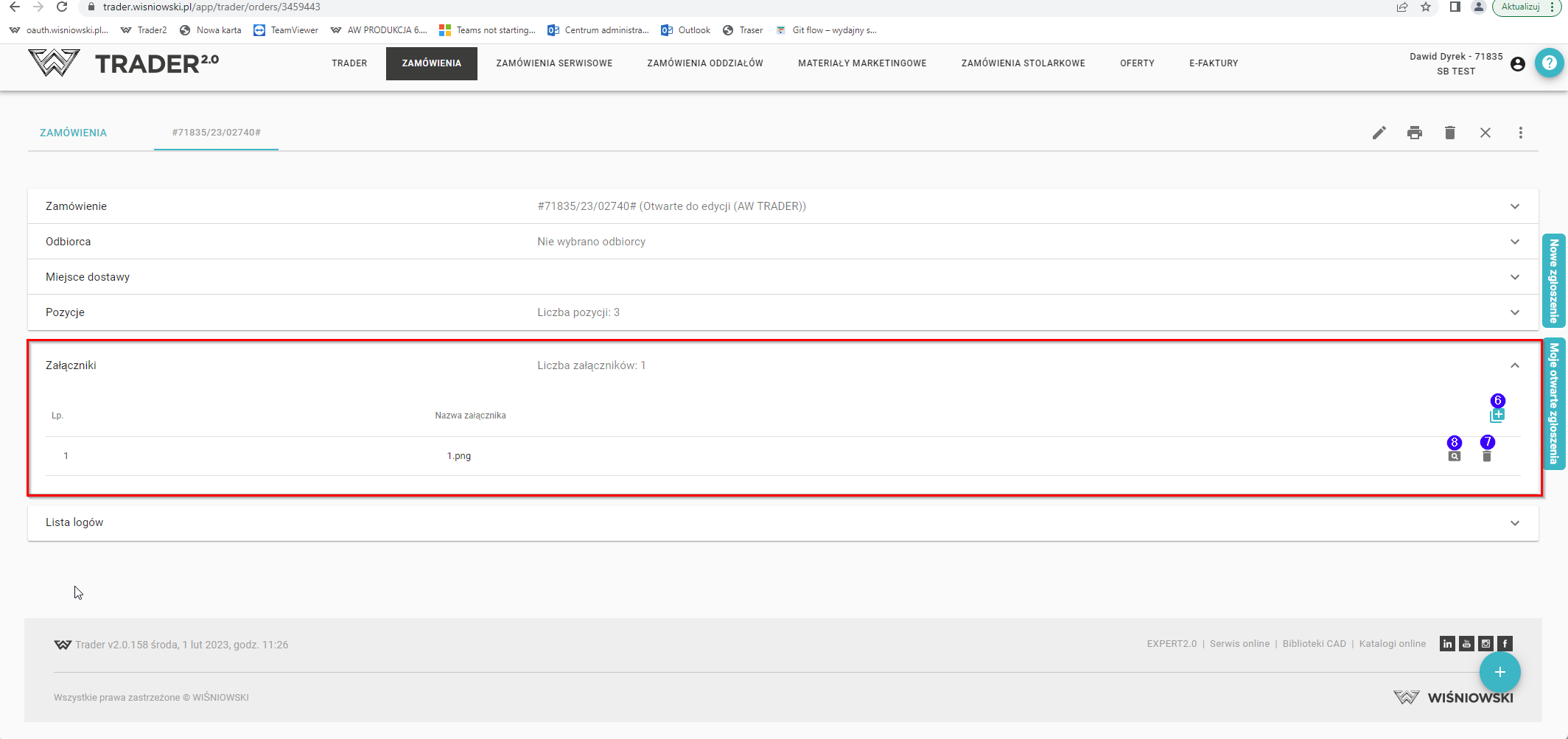 Załączniki: lista dodanych załączników, możesz dodać (6), usunąć (7) lub podejrzeć (8) załącznik (analogicznie Etap 3 - Dodawanie załączników do zamówienia)