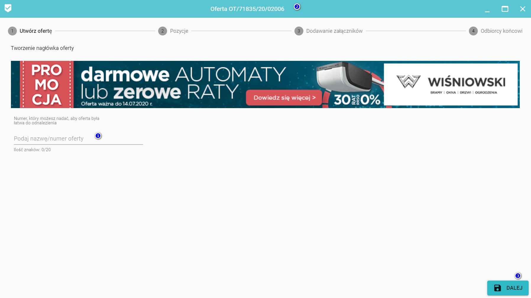 Nagłówek oferty - w tym kroku wprowadź swój numer oferty (1) (maksymalnie 20 znaków), który będzie widoczny również na belce górnej (2) i kliknij Dalej (3)
