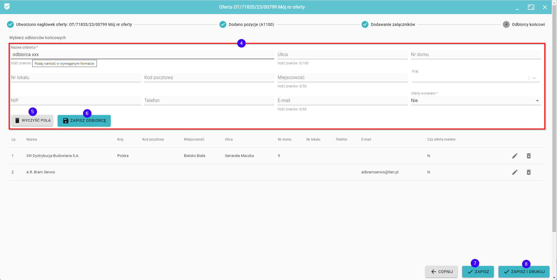 Kliknij Zapisz odbiorcę (6) i w zależności od potrzeb kliknij Zapisz (7) lub Zapisz i drukuj (8)