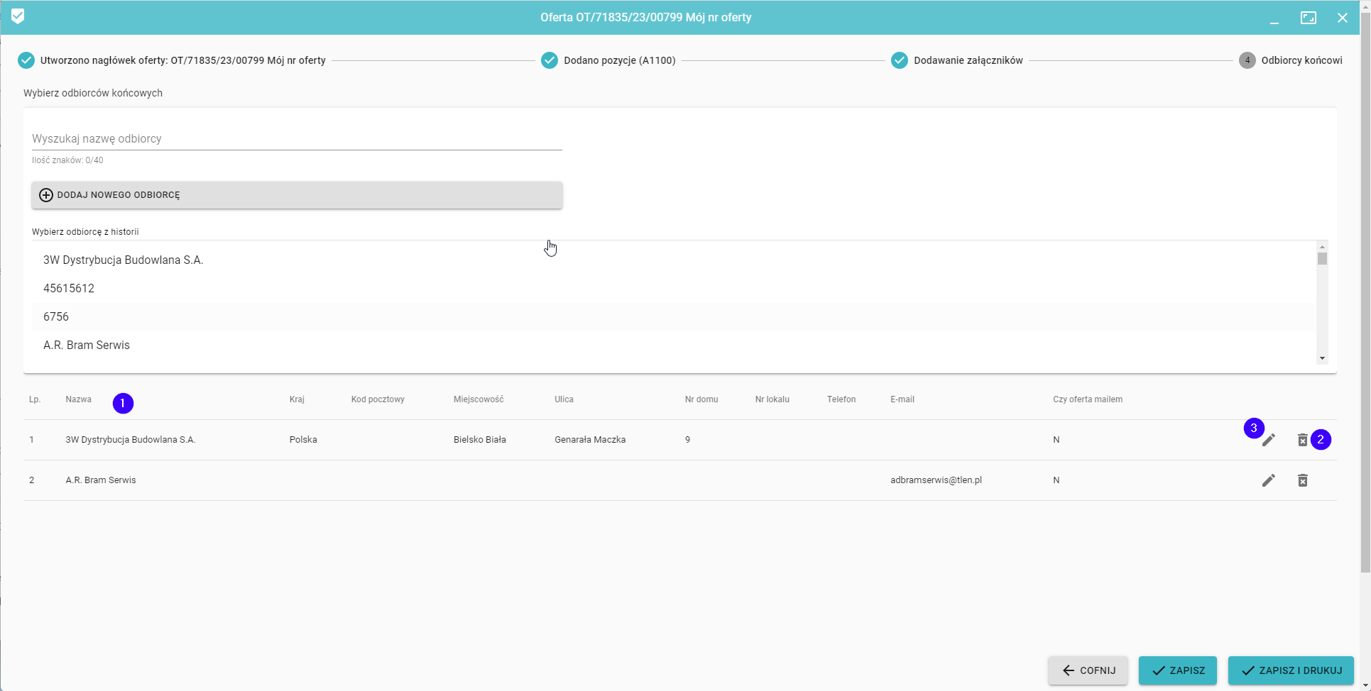 W przypadku oferty możemy dodawać kilku odbiorców, którzy po dodaniu widoczni są na liście pod formularzem wyboru (1). Istnieje również możliwość edycji (3) oraz usunięcia (2) dodanego odbiorcy.