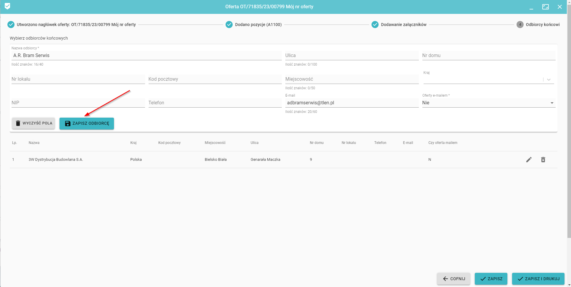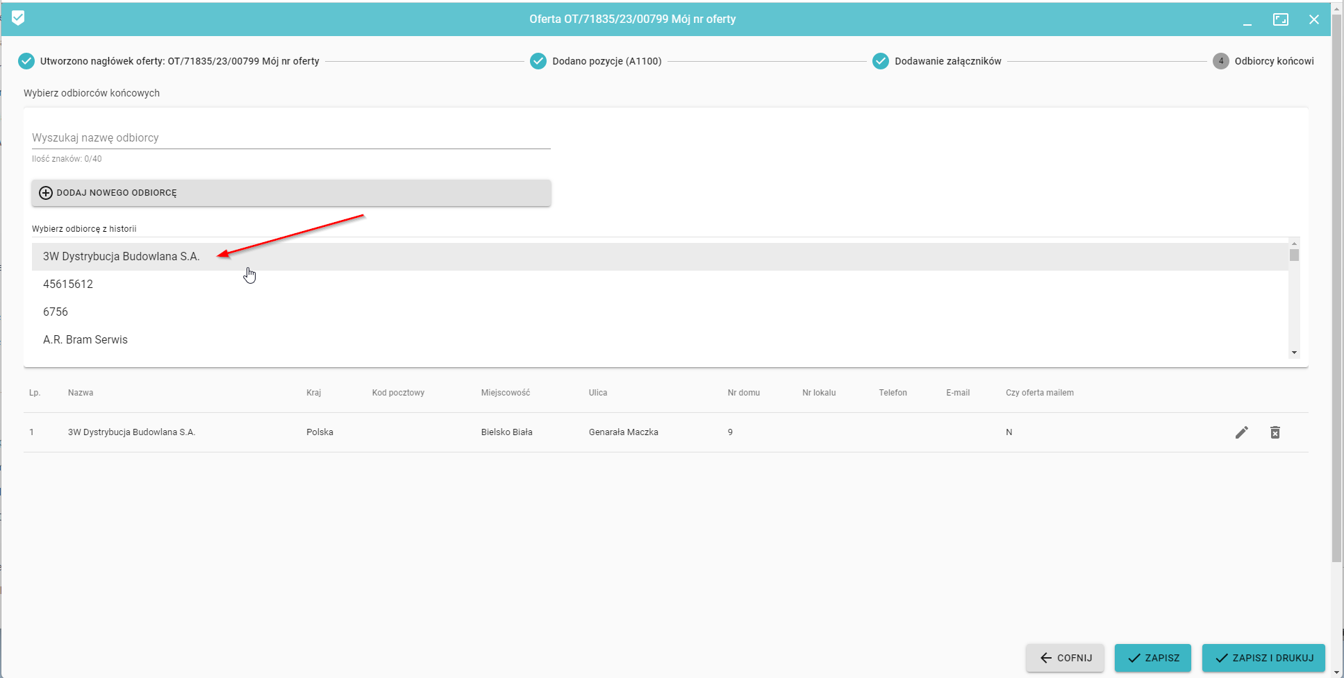 Wybierając odbiorcę z listy, zostanie on automatycznie dodany do formularza. Ostatecznie należy zapisać odbiorcę do oferty przez
