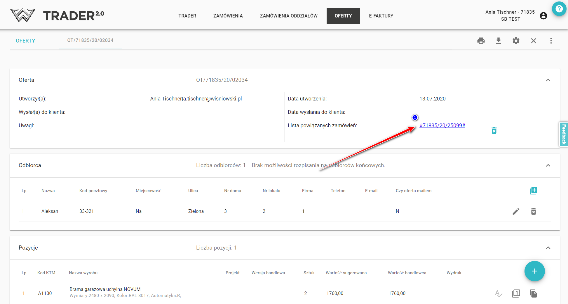 Na szczegółach oferty pojawi się lista powiązanych zamówień, a klikając w numer (1) zostaniesz automatycznie przeniesiony do utworzonego zamówienia. (Wygenerowane zamówienie możesz także odnaleźć w zakładce ZAMÓWIENIA na liście zamówień).