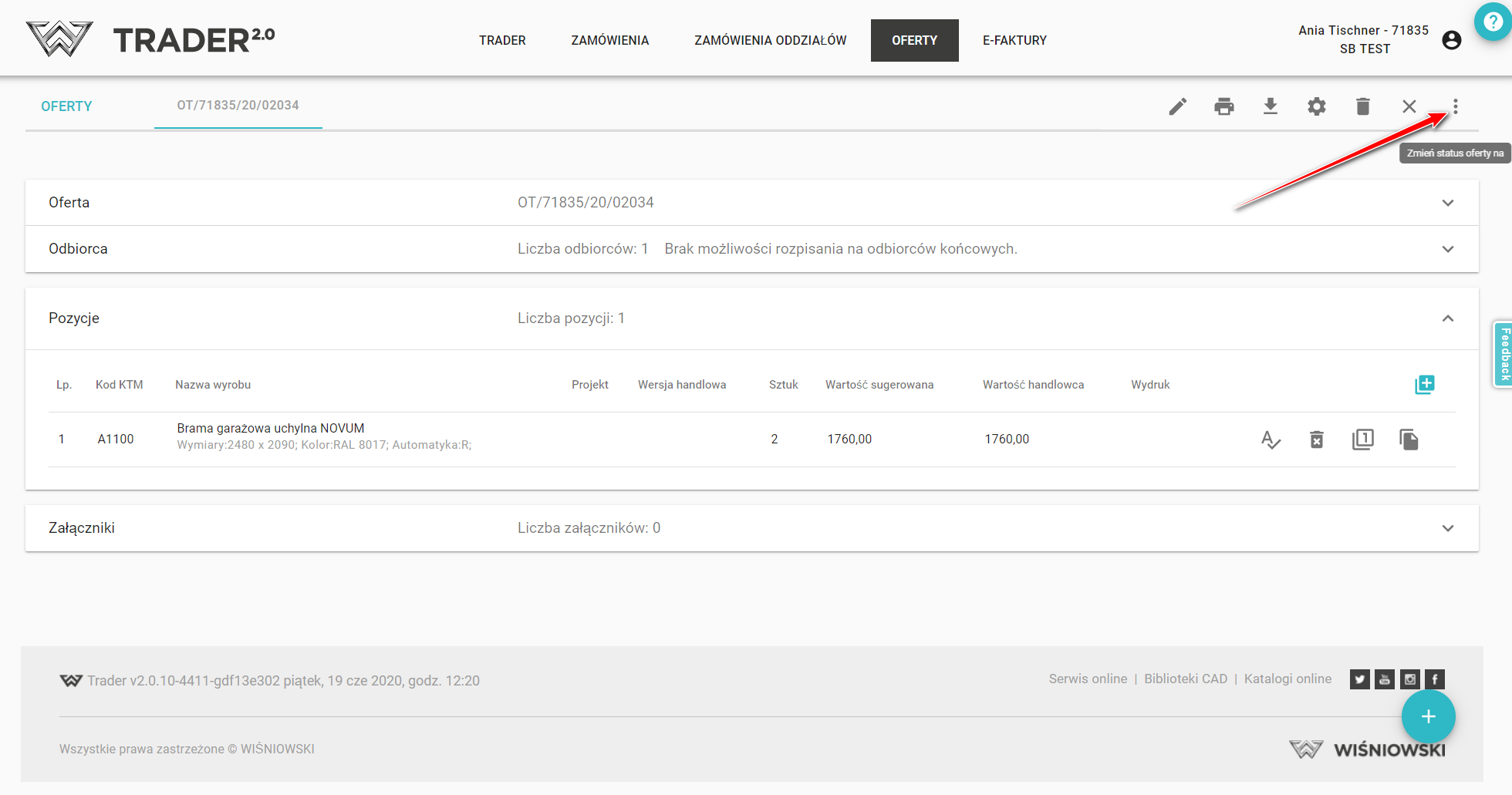 W celu wygenerowania zamówienia z oferty, otwórz wprowadzoną ofertę i w prawym górnym rogu kliknij ikonę zmiany statusu.
