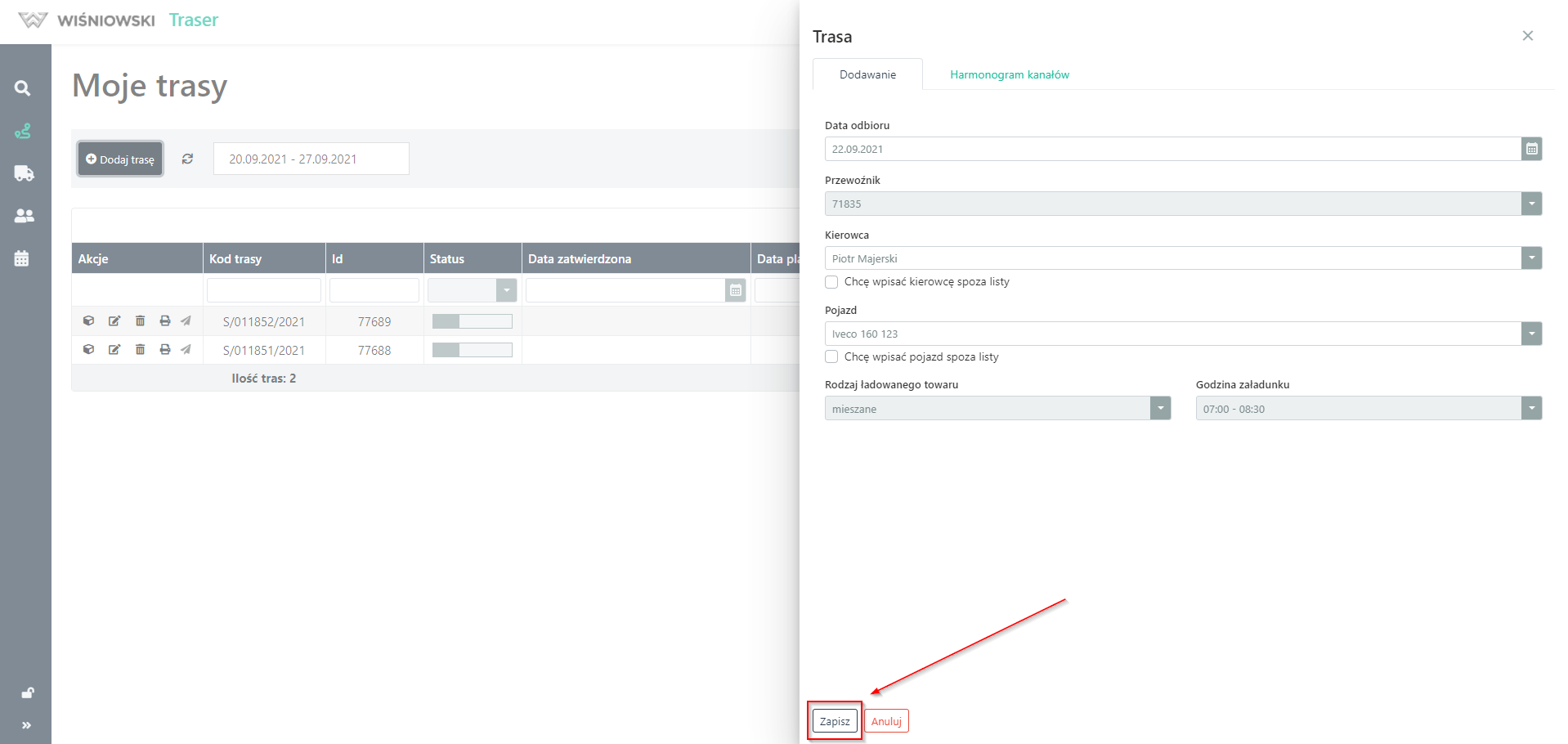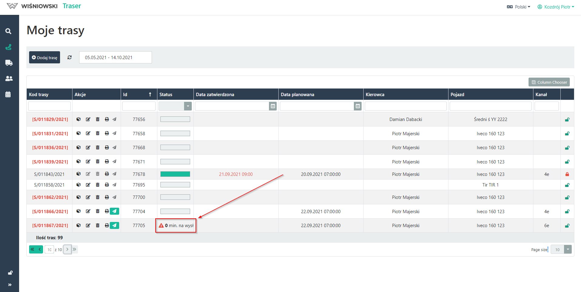 Czas pozostały na wysyłkę danej trasy widnieje w zakładce "Pokaż trasy".