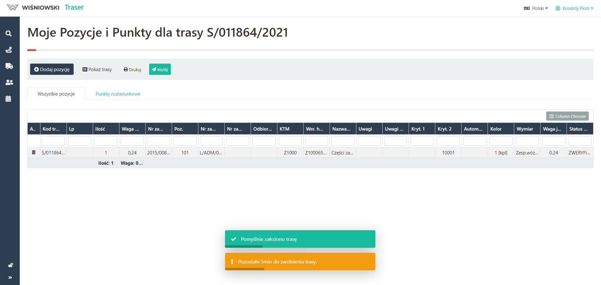 Po utworzeniu trasy trasy, użytkownik ma określony czas na dodanie pozycji do Trasy (60 minut) oraz na wysłanie Trasy do weryfikacji (kolejne 60 minut). W przypadku nie dodania żadnej pozycji w określonym czasie, trasa nie zostanie utworzona. Natomiast w przypadku nie przesłania trasy z dodanymi pozycjami w założonym czasie, zwolniona zostanie data odbioru towaru oraz kanał załadunku.