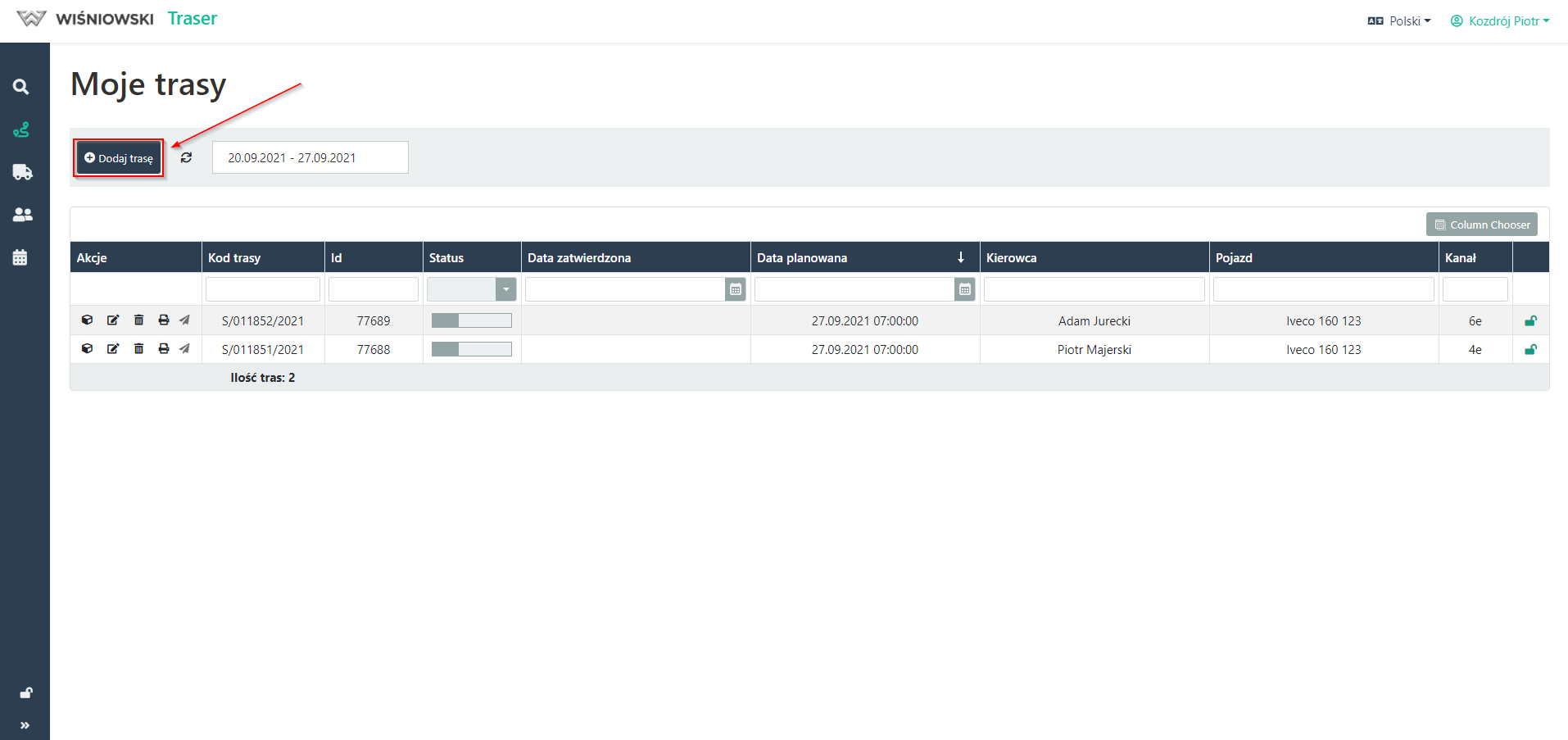 1. W Lewym górnym rogu kliknij przycisk "Dodaj trasę" (Rys. 1.). Powinien otworzyć się boczny panel.
