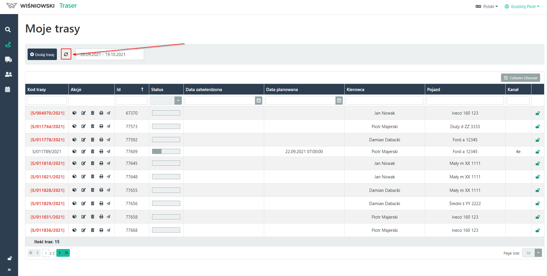 Statusy Tras w Traserze odświeżają się po każdym załadowaniu listy Tras. Aby ręcznie odświeżyć Trasy, kliknij przycisk "ODŚWIEŻ" (Rys. 4.).