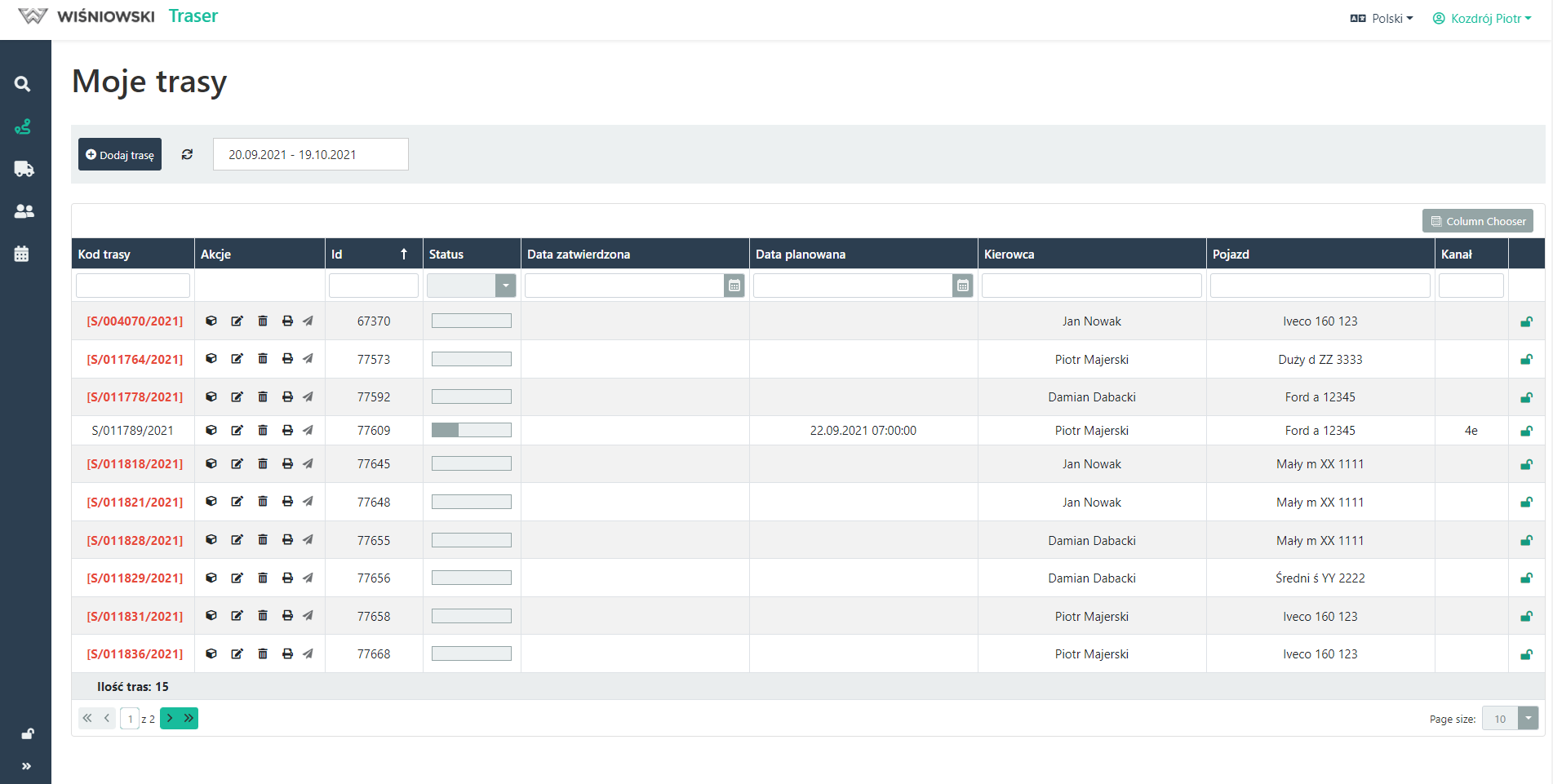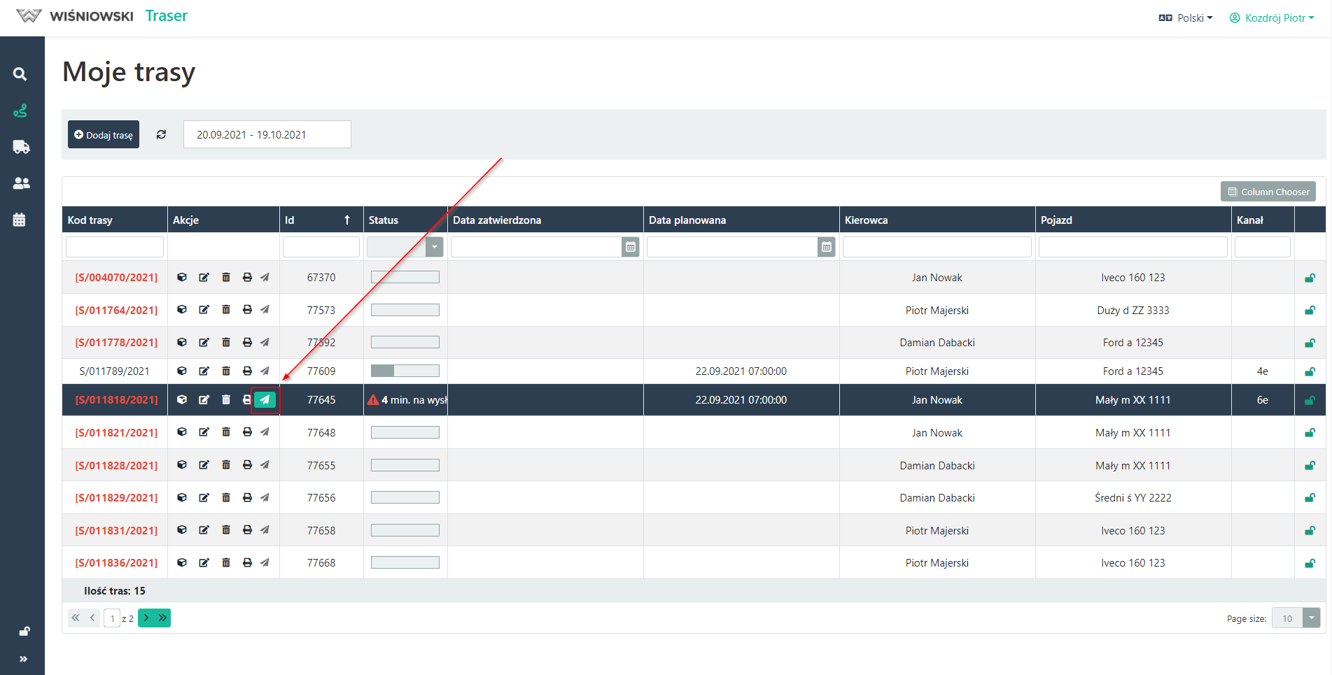 Aby zobaczyć status danej Trasy, należy wyświetlić listę Tras (Rys. 2.).