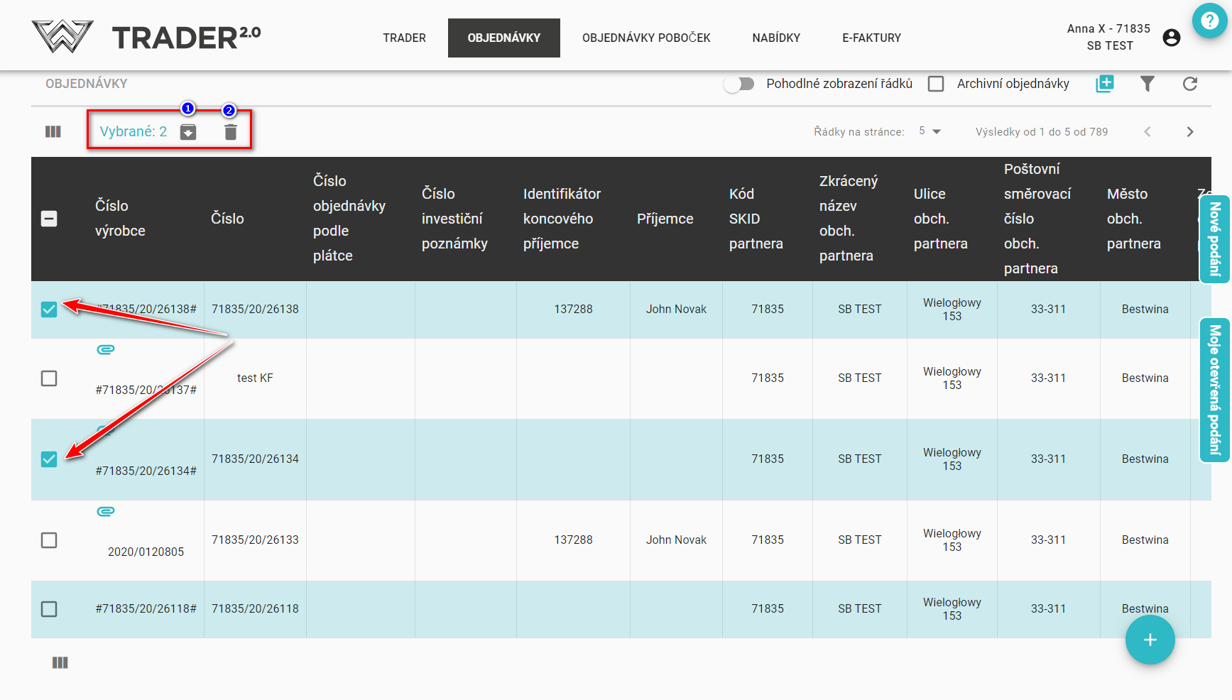 K dispozici je také možnost vybrat nebo zrušit /výběr jedné nebo více položek, v takovém případě se aktivují možnosti 'Archivovat' (1) a 'Odstranit' (2) (pozor! hlavní checkbox nevybere všechny, ale maximálně 200 položek)