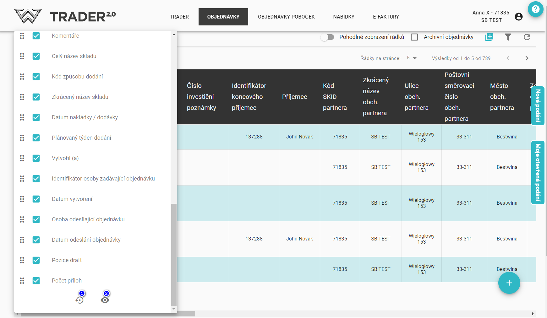 V jednotlivých seznamech můžete sami nastavit zobrazení sloupců, např. skrýt ty, které nechcete zobrazovat. Chcete-li to provést, klikněte na ikonu