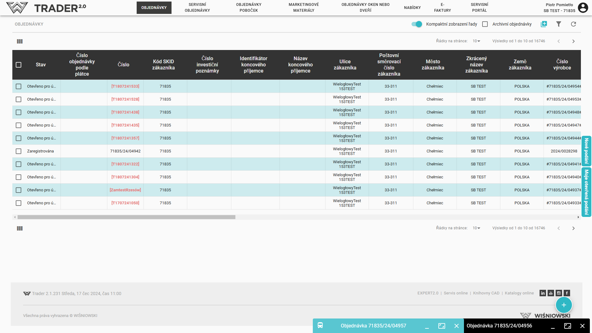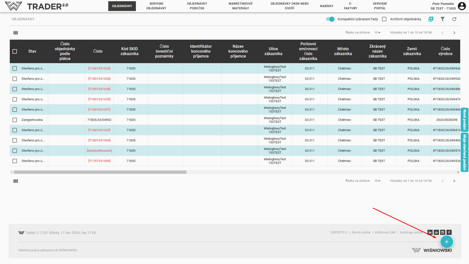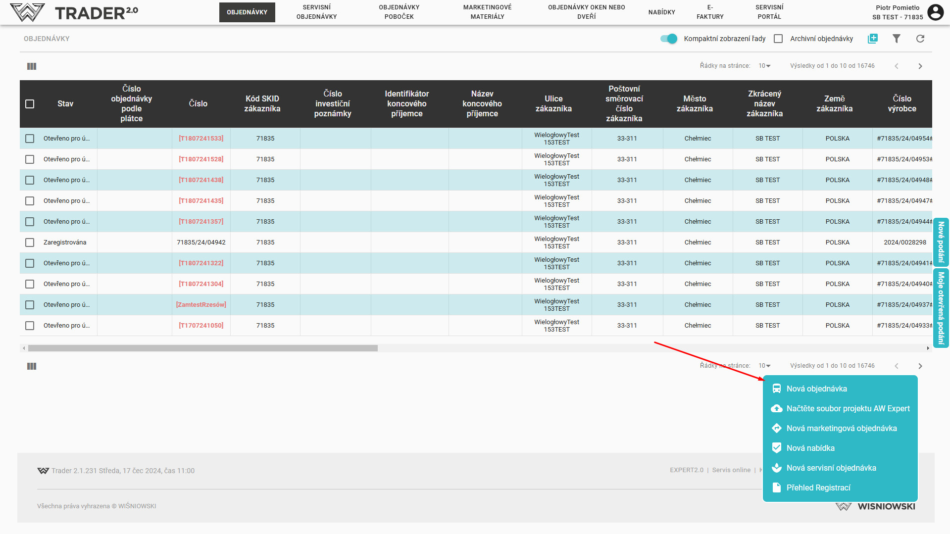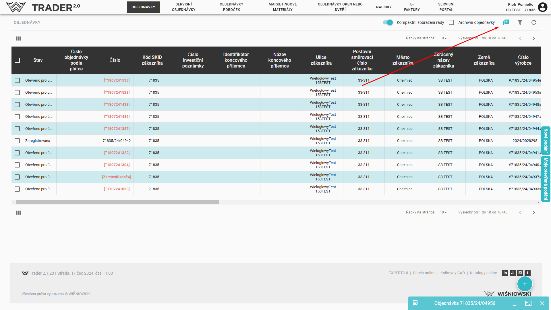 Kromě toho je možné zadat novou objednávku pomocí tlačítka umístěného v pravém horním rohu nad seznamem objednávek.