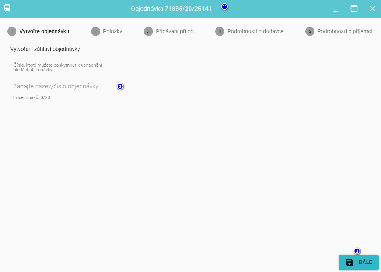 Záhlaví objednávky - v tomto kroku můžete zadat číslo objednávky (1), které se zobrazí také na horní liště (2) - po dokončení klikněte na tlačítko Další (3)