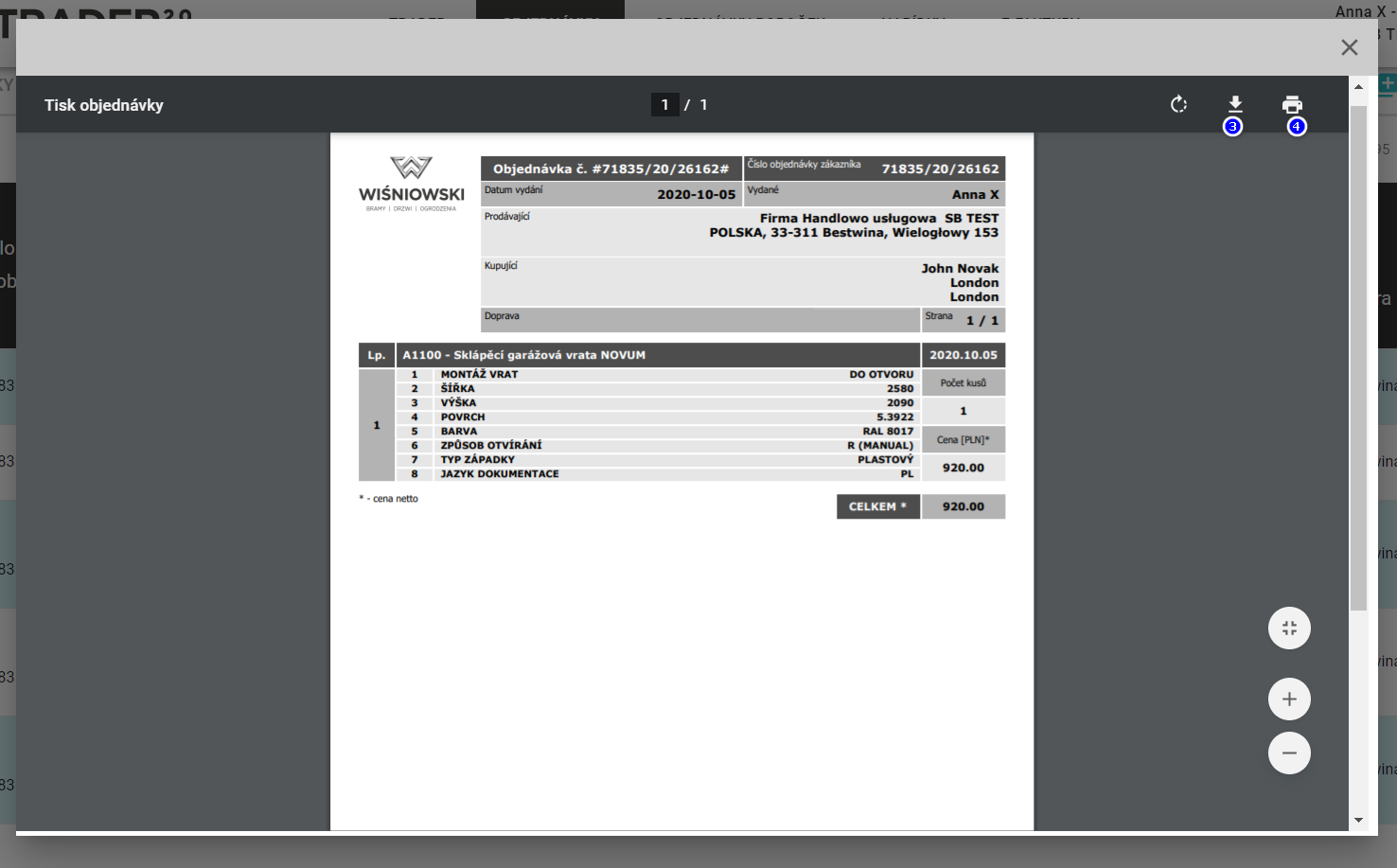 Kliknutím na něj se vygeneruje výtisk objednávky ve formátu PDF. Vygenerovaný soubor lze stáhnout (3) a uložit do počítače nebo vytisknout (4).