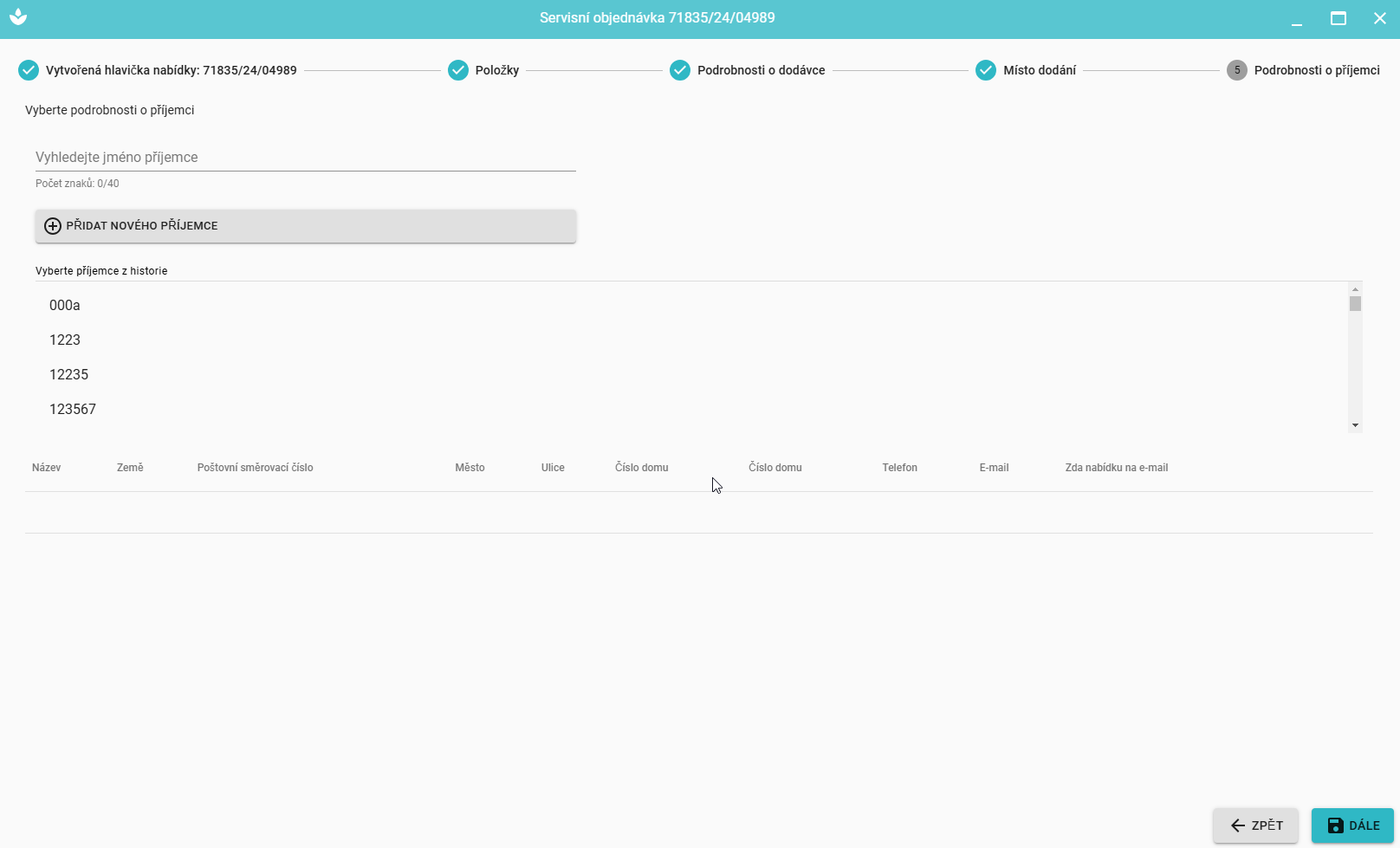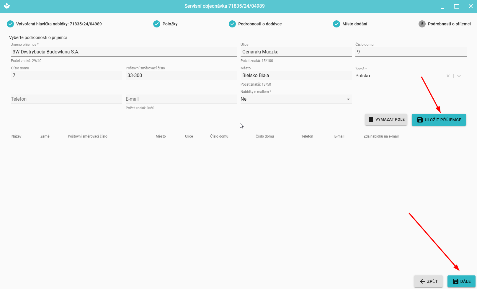 V posledním kroku můžeme vybrat nebo přidat údaje o příjemci a údaje o doručení (stejná činnost jako v Krok 5 - Údaje o příjemci ).