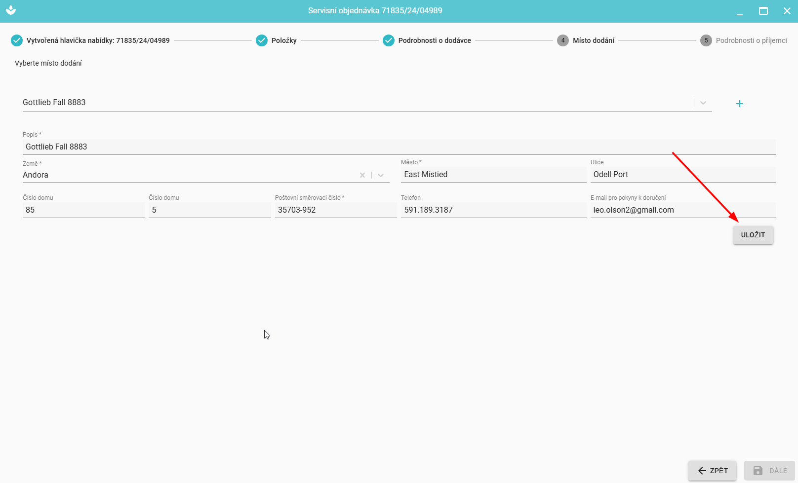 V dalším kroku můžeme vyplnit nebo vybrat ze seznamu Místo dodání (akceptujeme kliknutím na tlačítko Uložit).