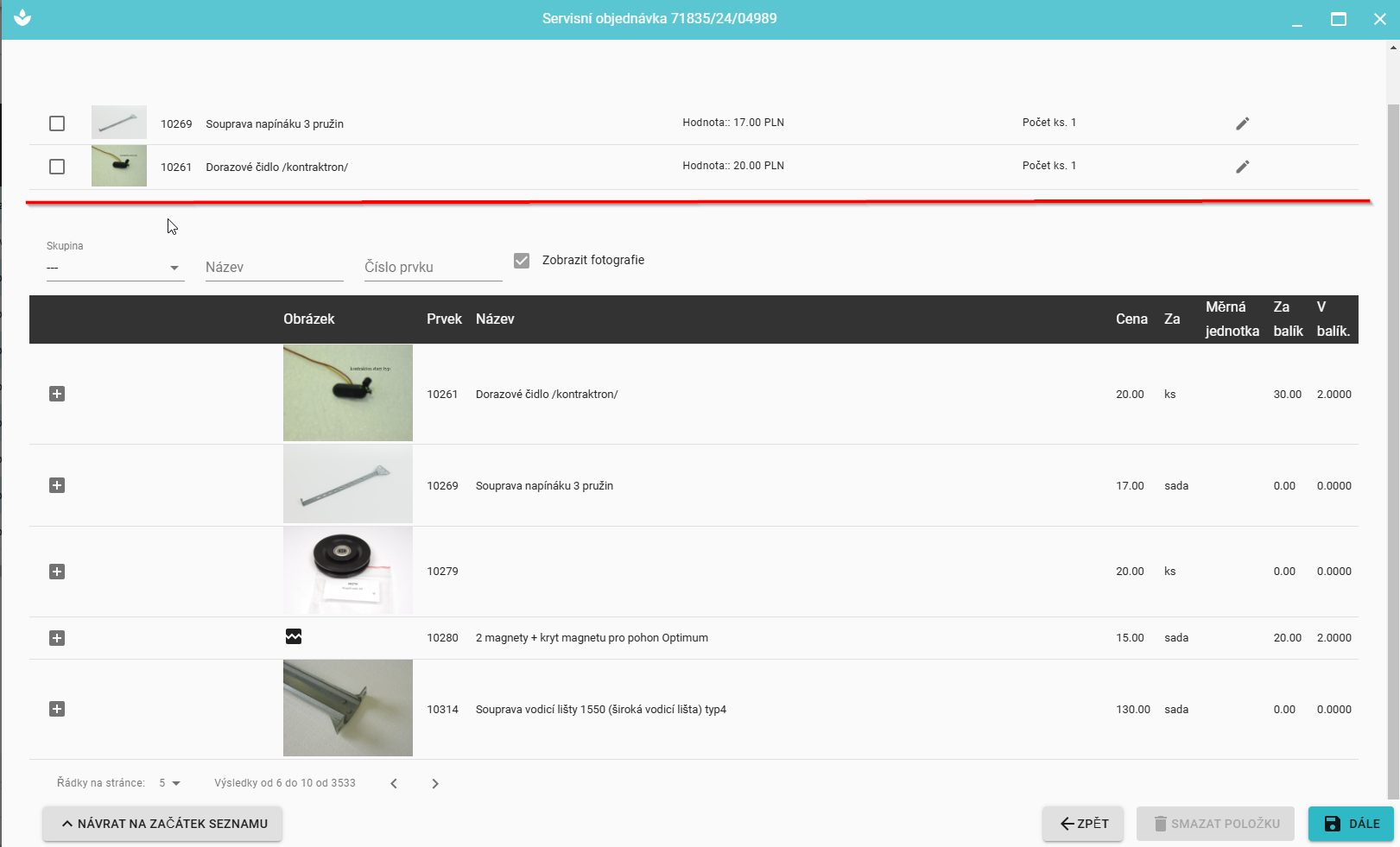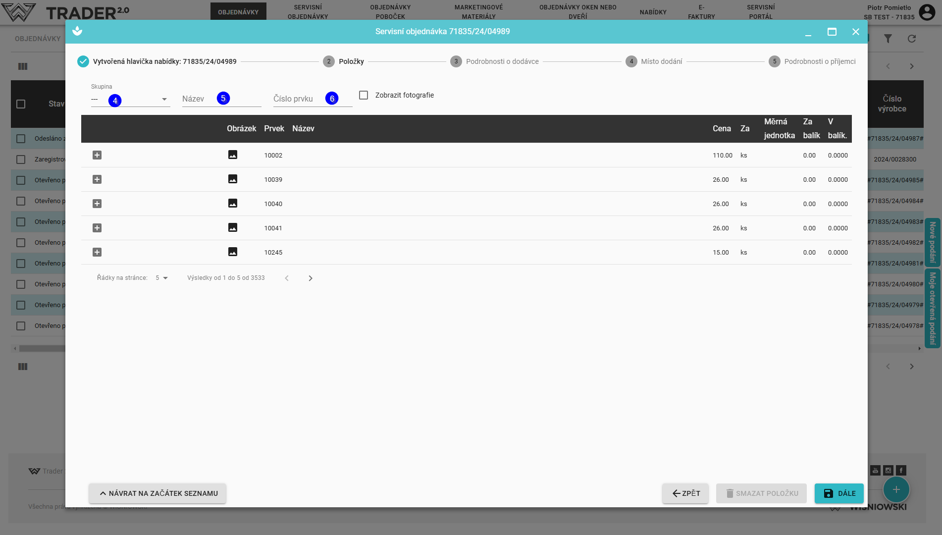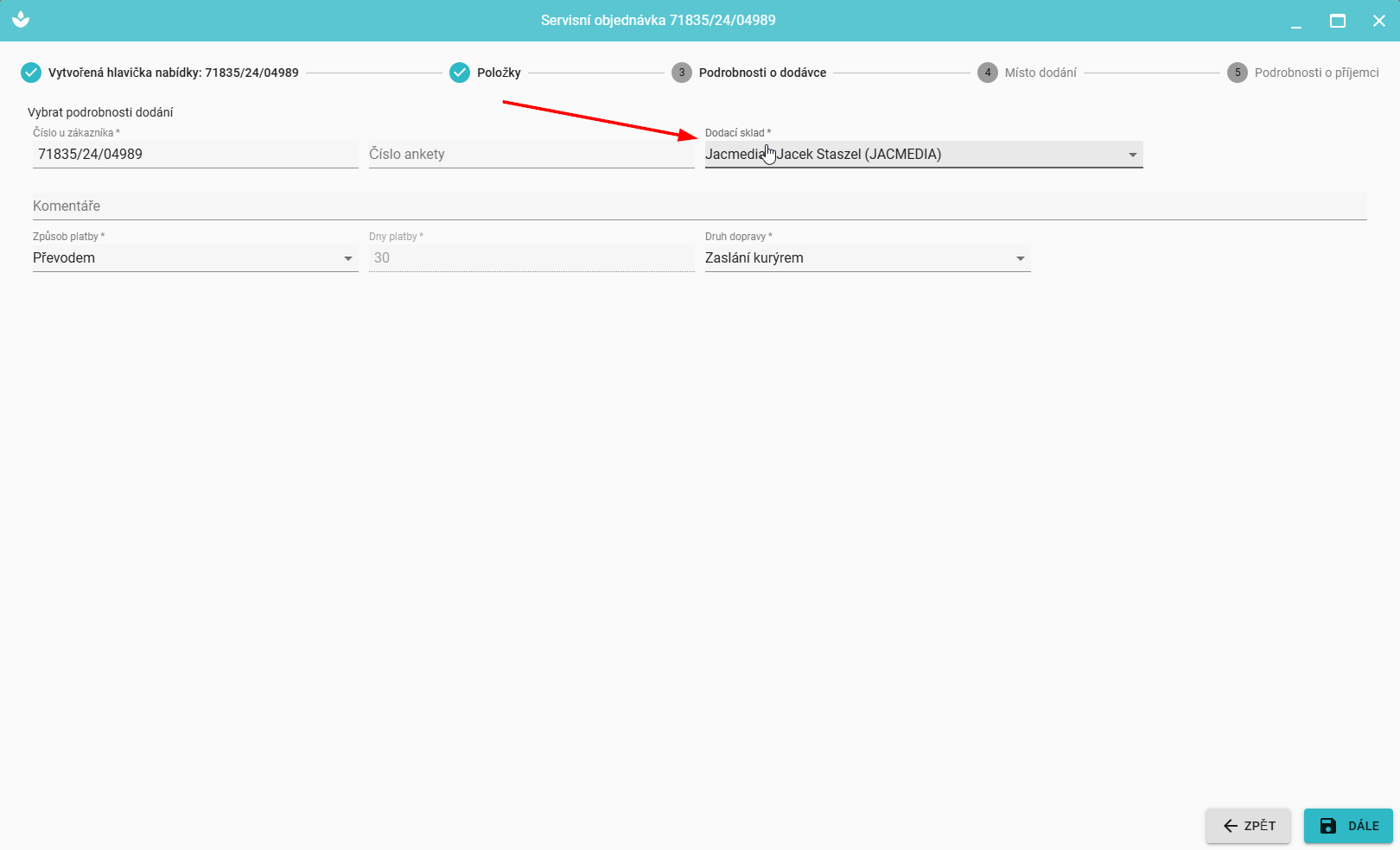 Po kliknutí na tlačítko „Další“ se servisní objednávka uloží a bude k dispozici v seznamu objednávek.