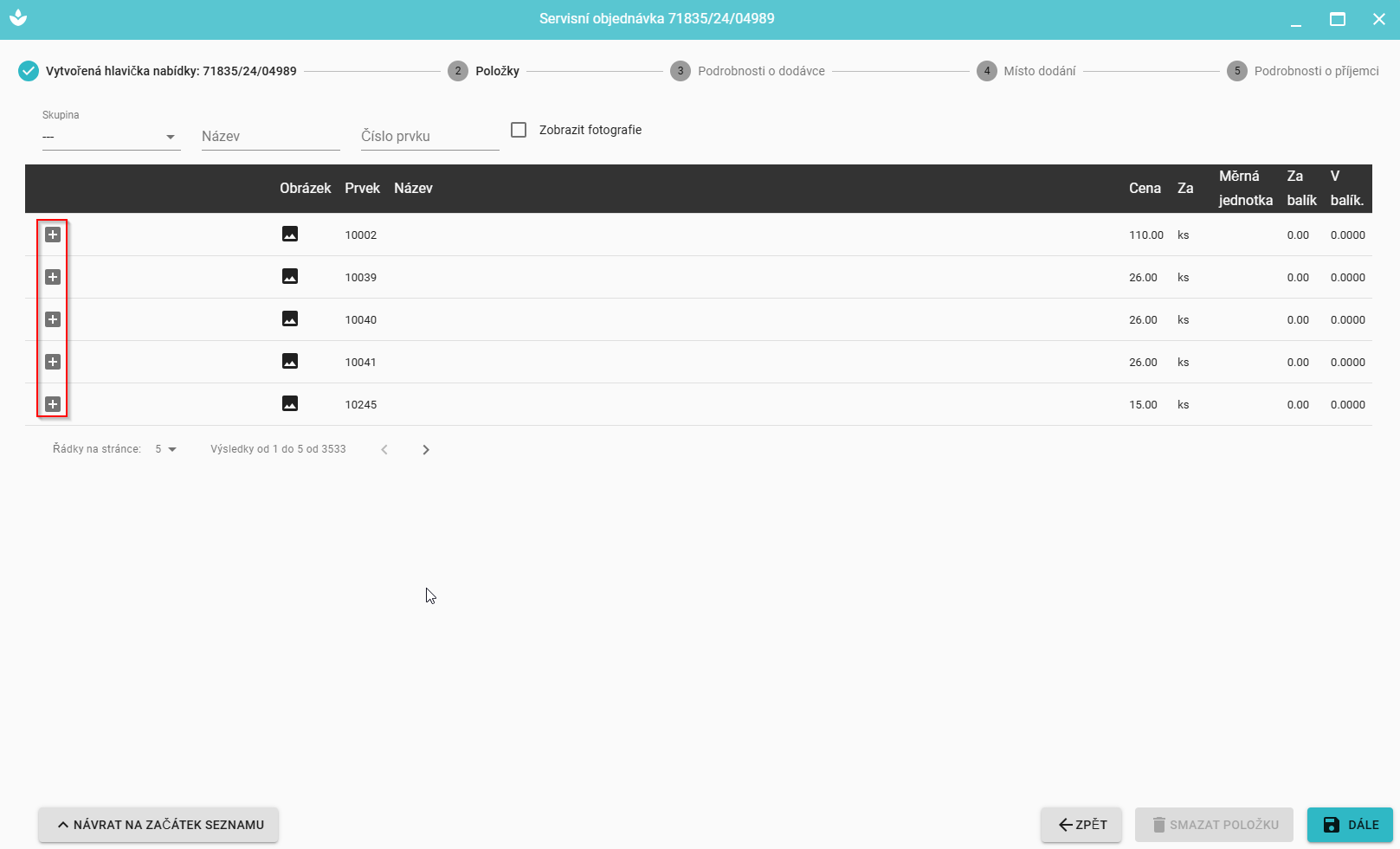Položky se do objednávky přidávají kliknutím na „plus“ na levé straně každého záznamu.