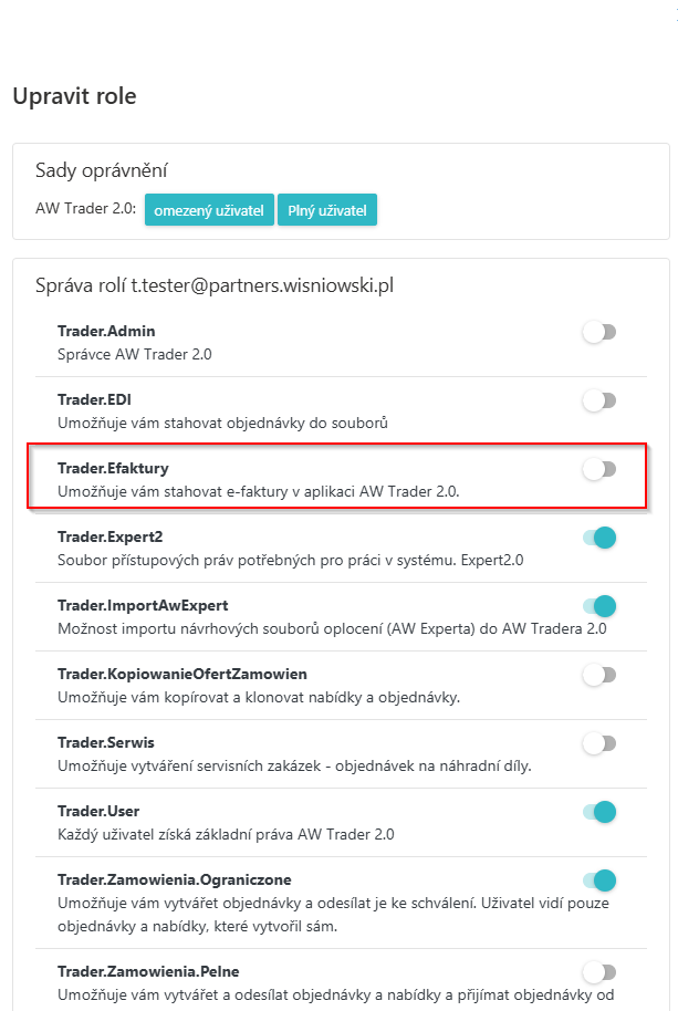 Přístup na tuto záložku je omezen. Pokud máte práva správce pro správu vaší firmy, můžete přidělit roli Trader E-faktury vybraným osobám na panelu administrace..