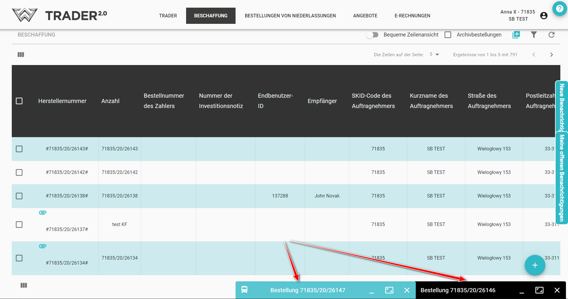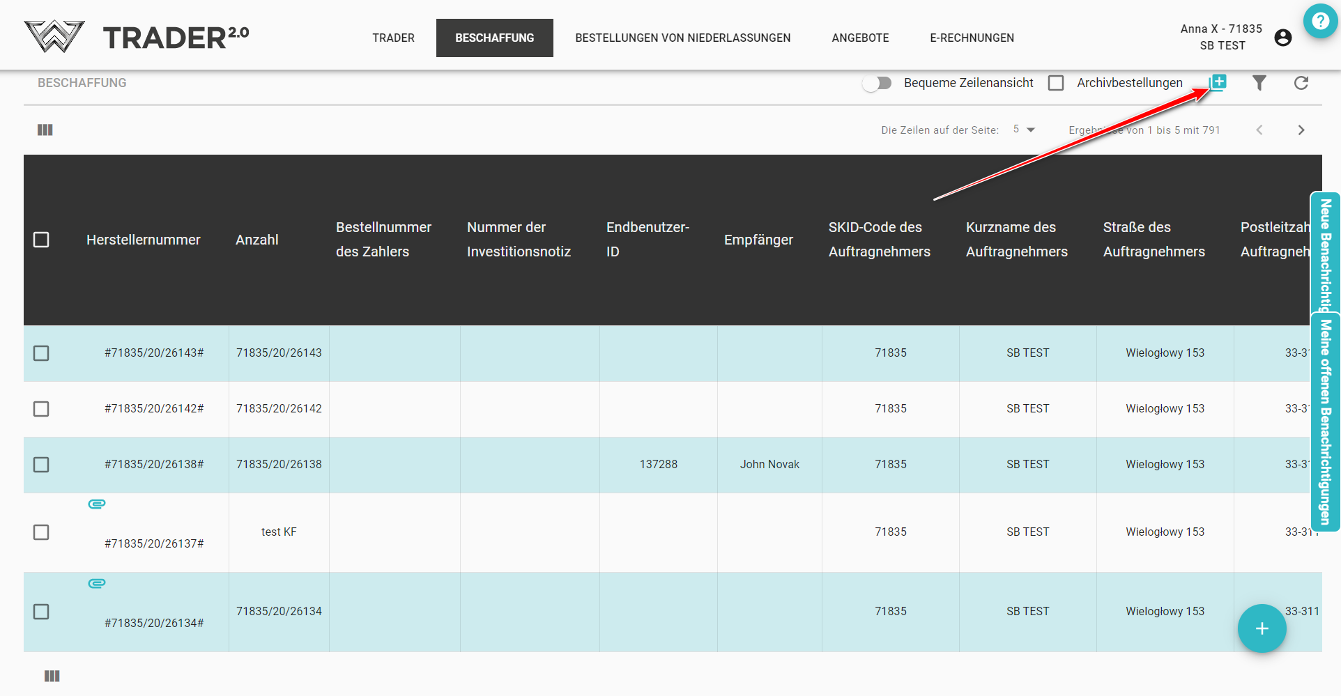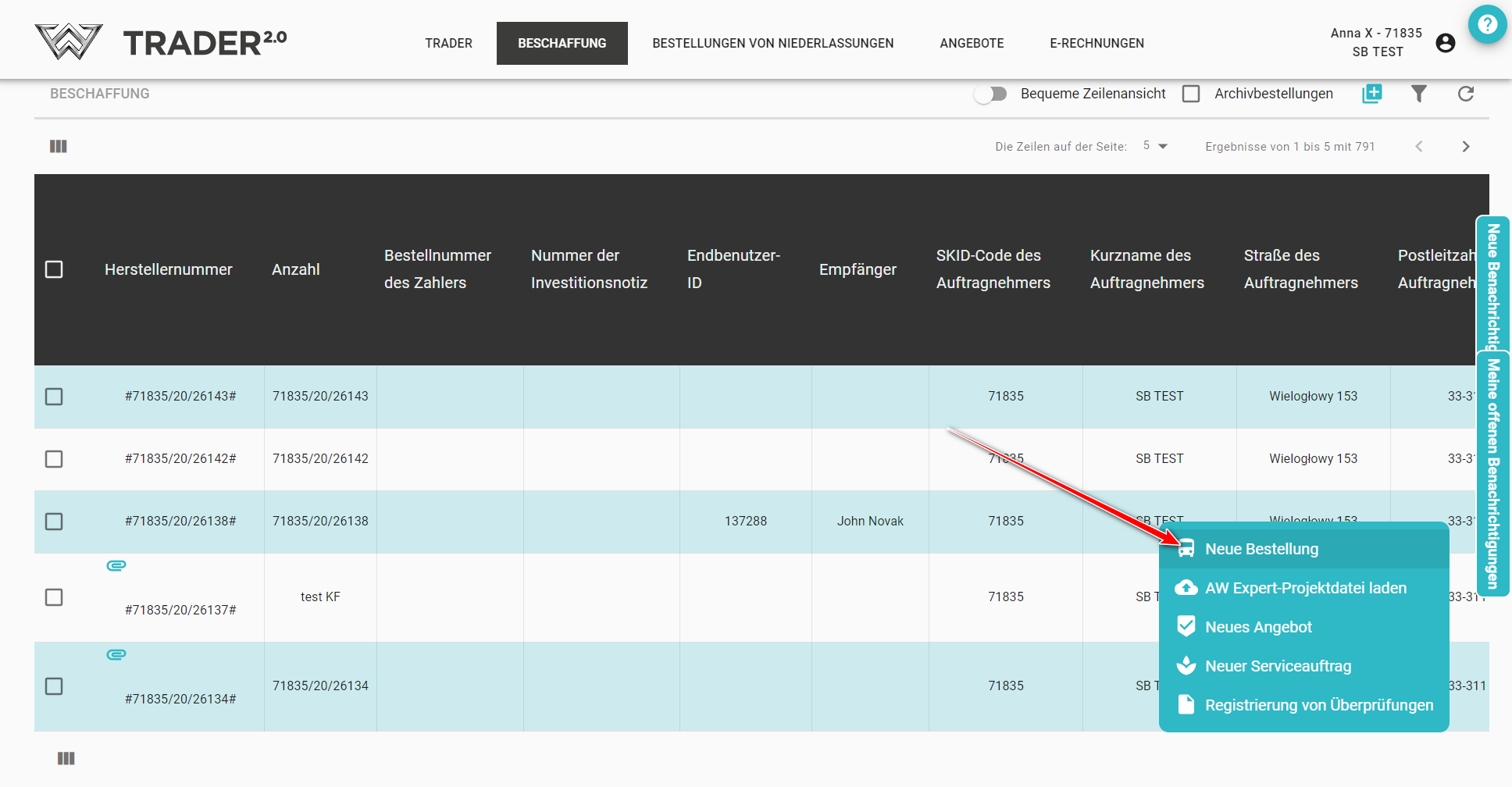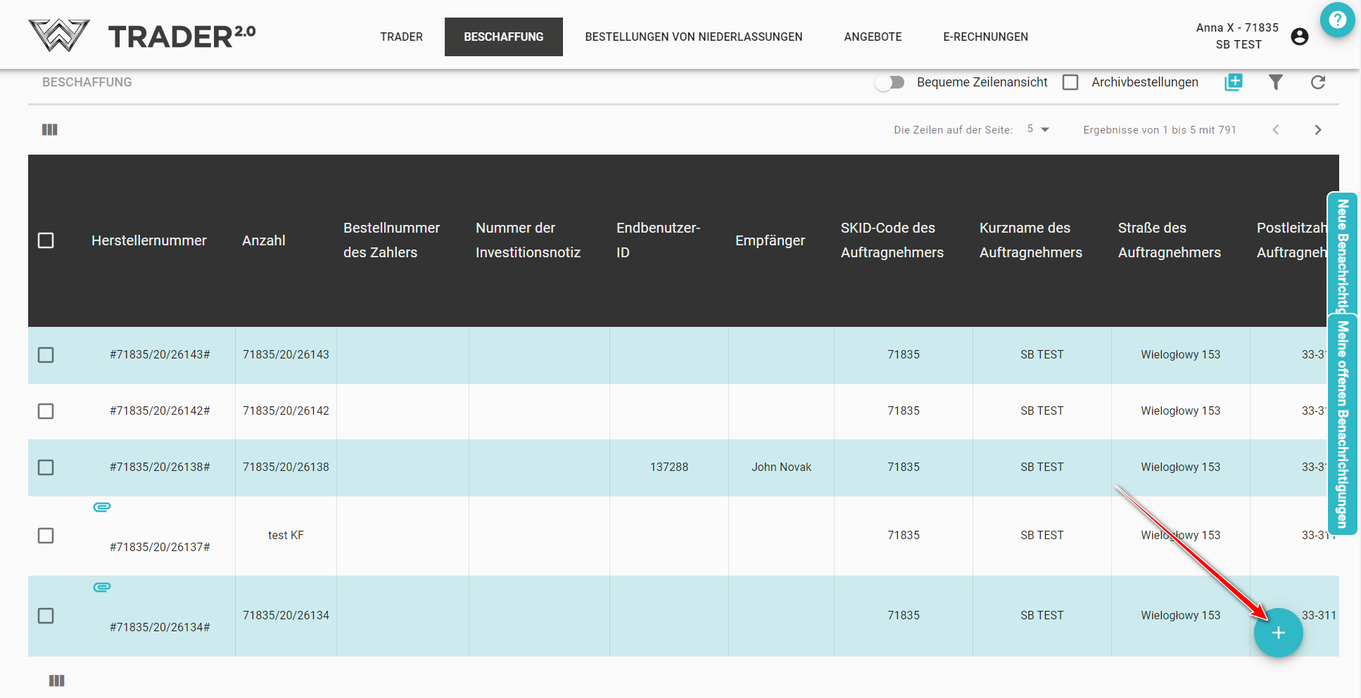 Außerdem ist es möglich, eine neue Bestellung über die Taste oben rechts über der Liste der Bestellungen einzugeben.