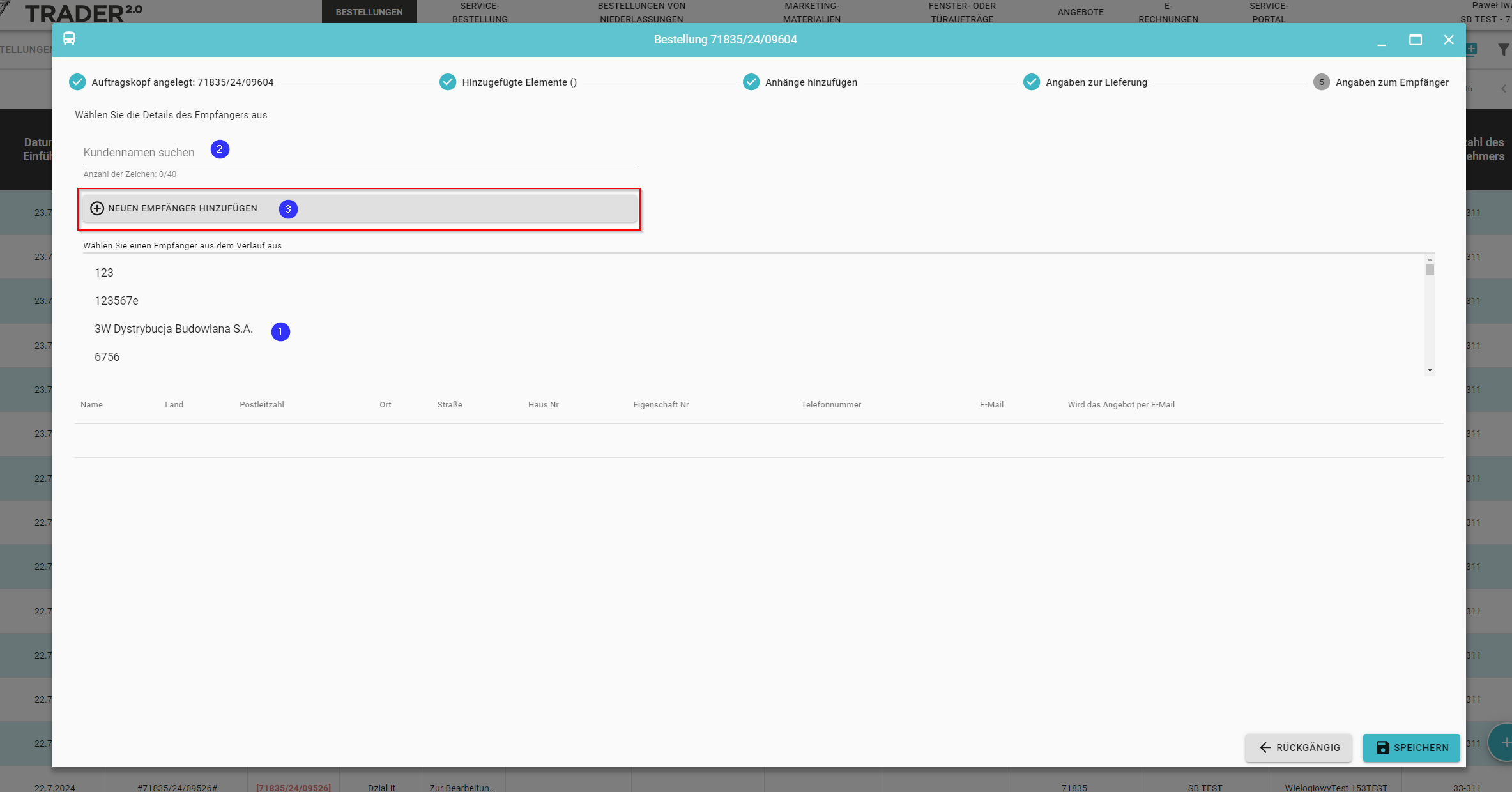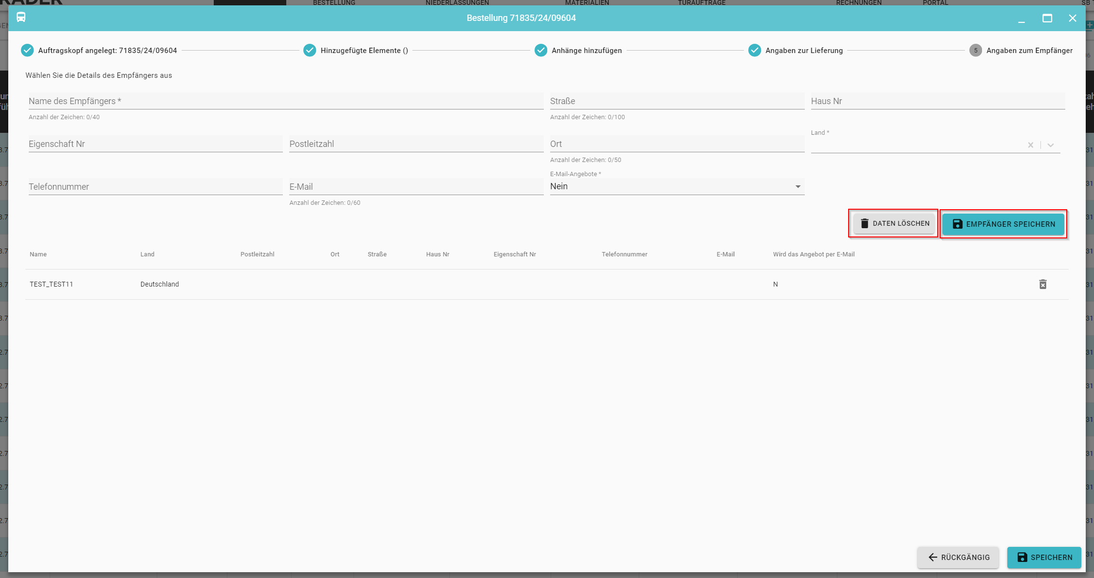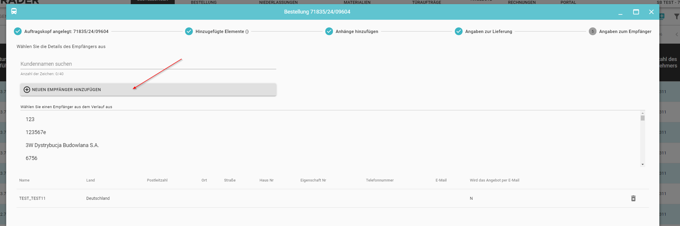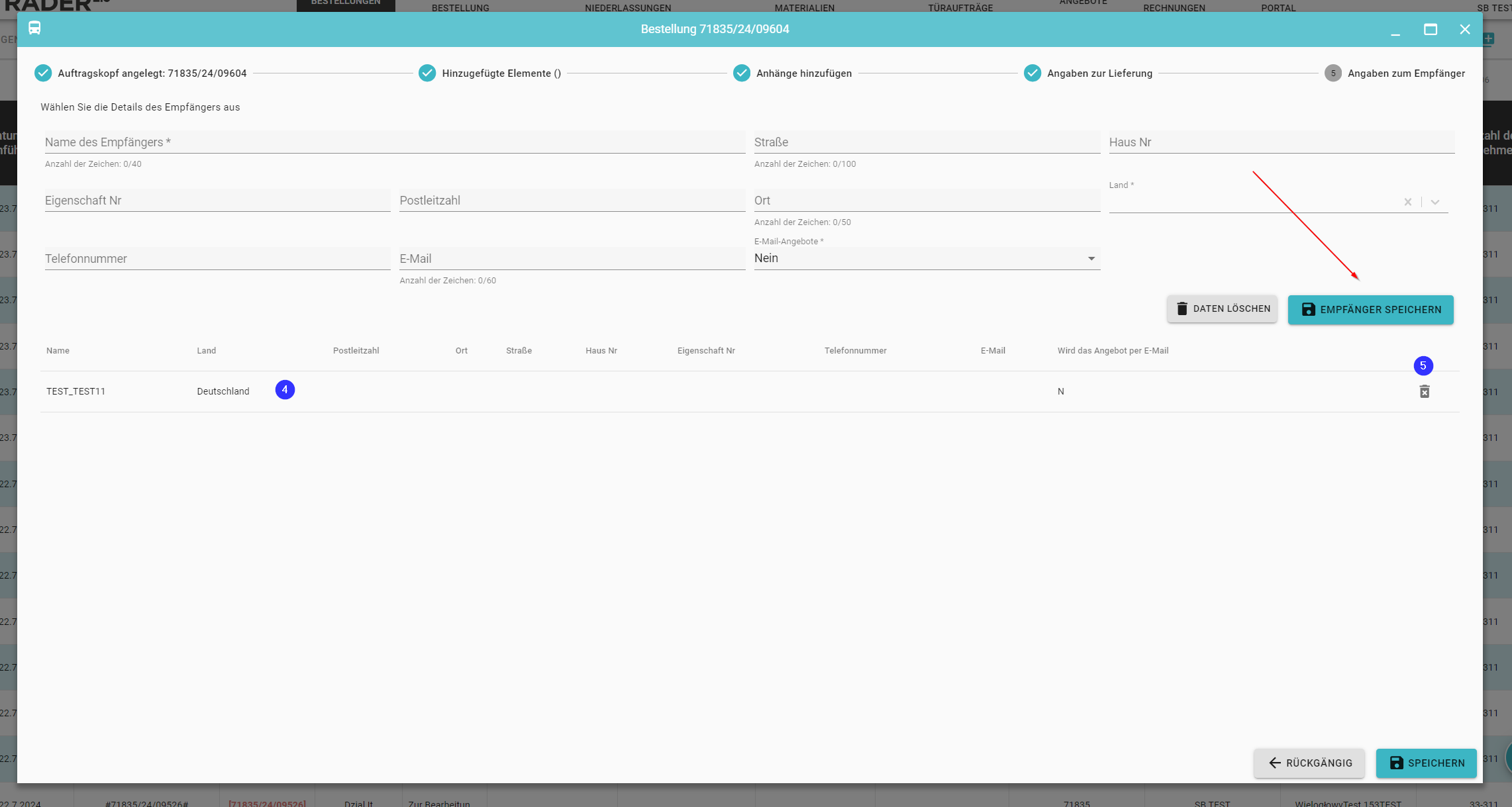 Wenn Sie einen Empfänger aus der aktuellen Bestellung entfernen möchten, können Sie dies tun, indem Sie auf das Symbol klicken (5)
