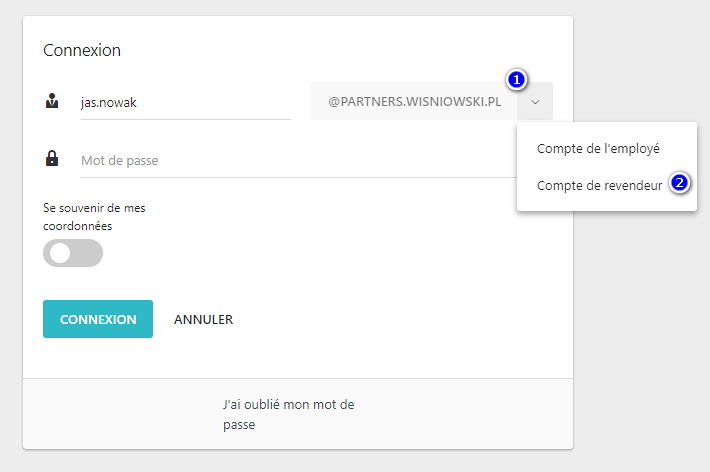 Pour se connecter à l'application, il faut aller sur le site https://trader.wisniowski.pl. De la liste de sélection (1) indiquez si vous êtes un employé ou un revendeur - en sélectionnant Compte de revendeur (2)