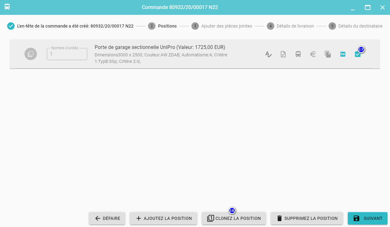 Dans une commande donnée, vous pouvez cloner des positions simplement en cochant les positions de la commande prévues pour le clonage (17) et cliquez ensuite sur (18).