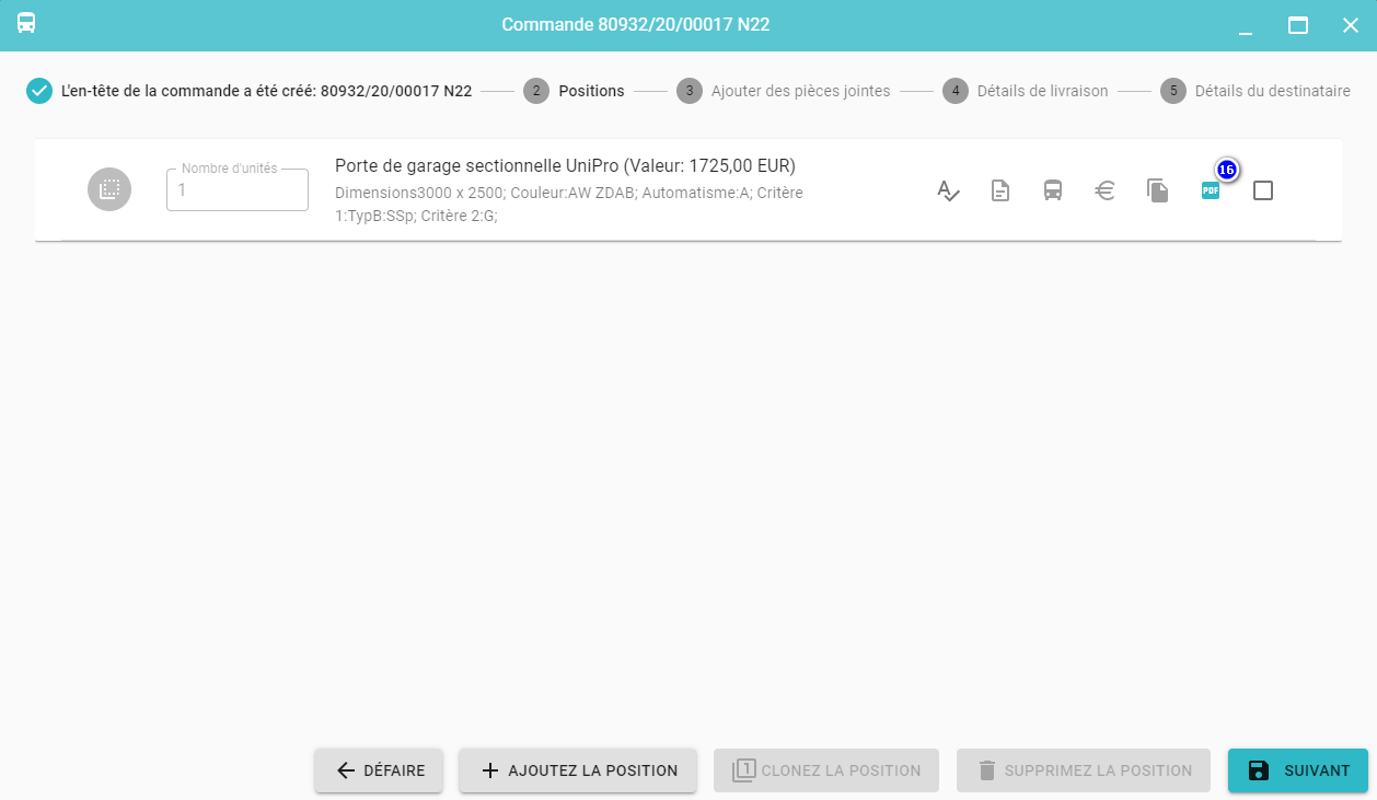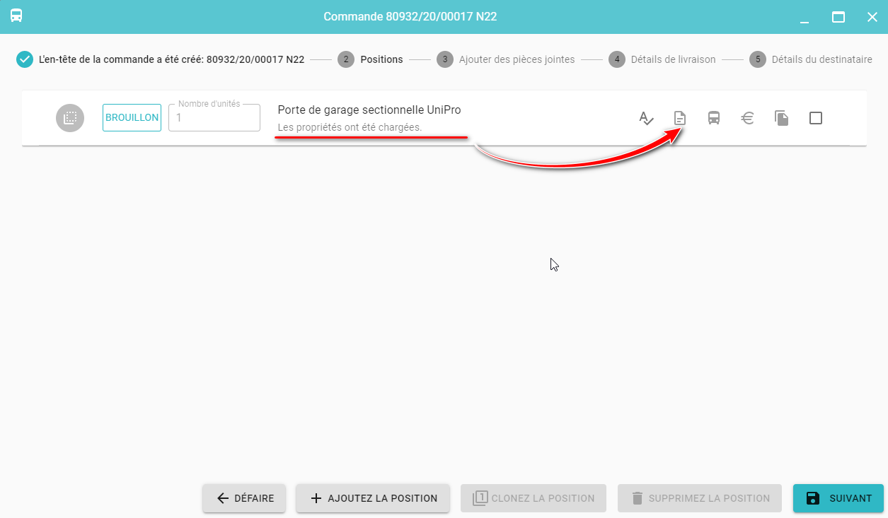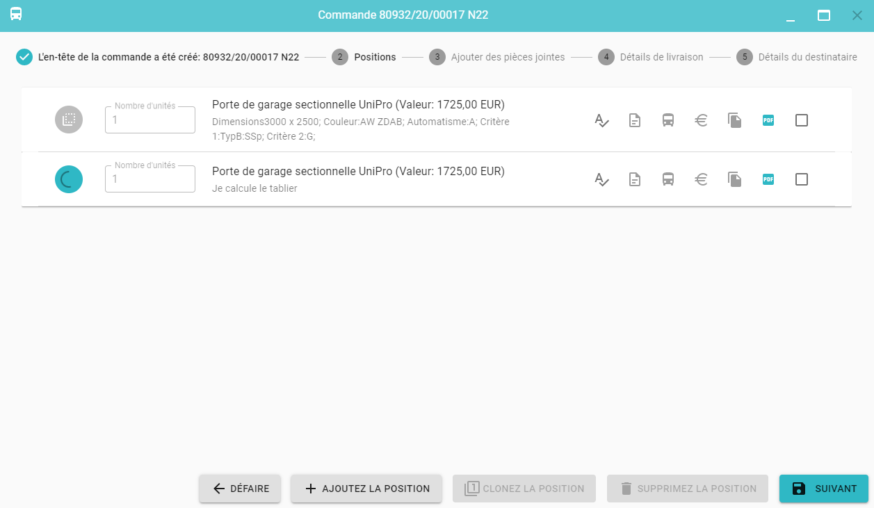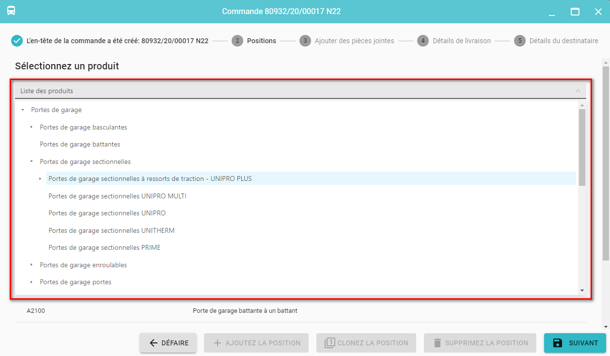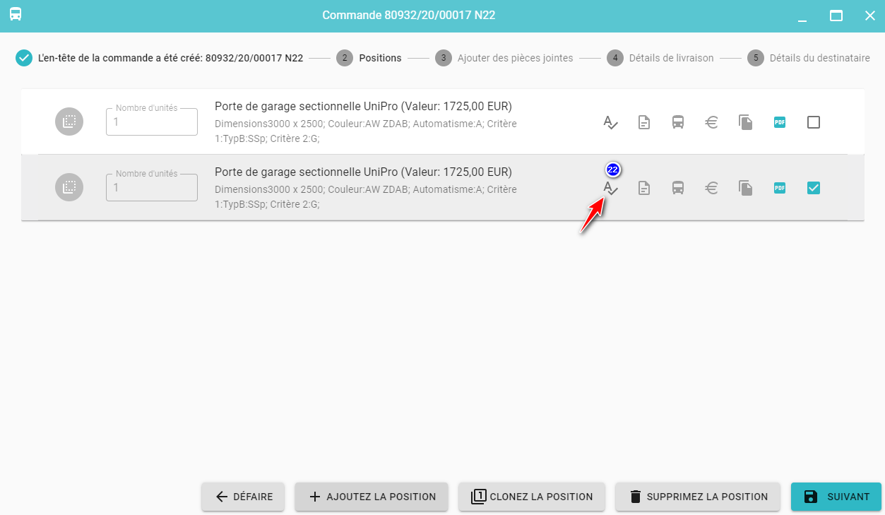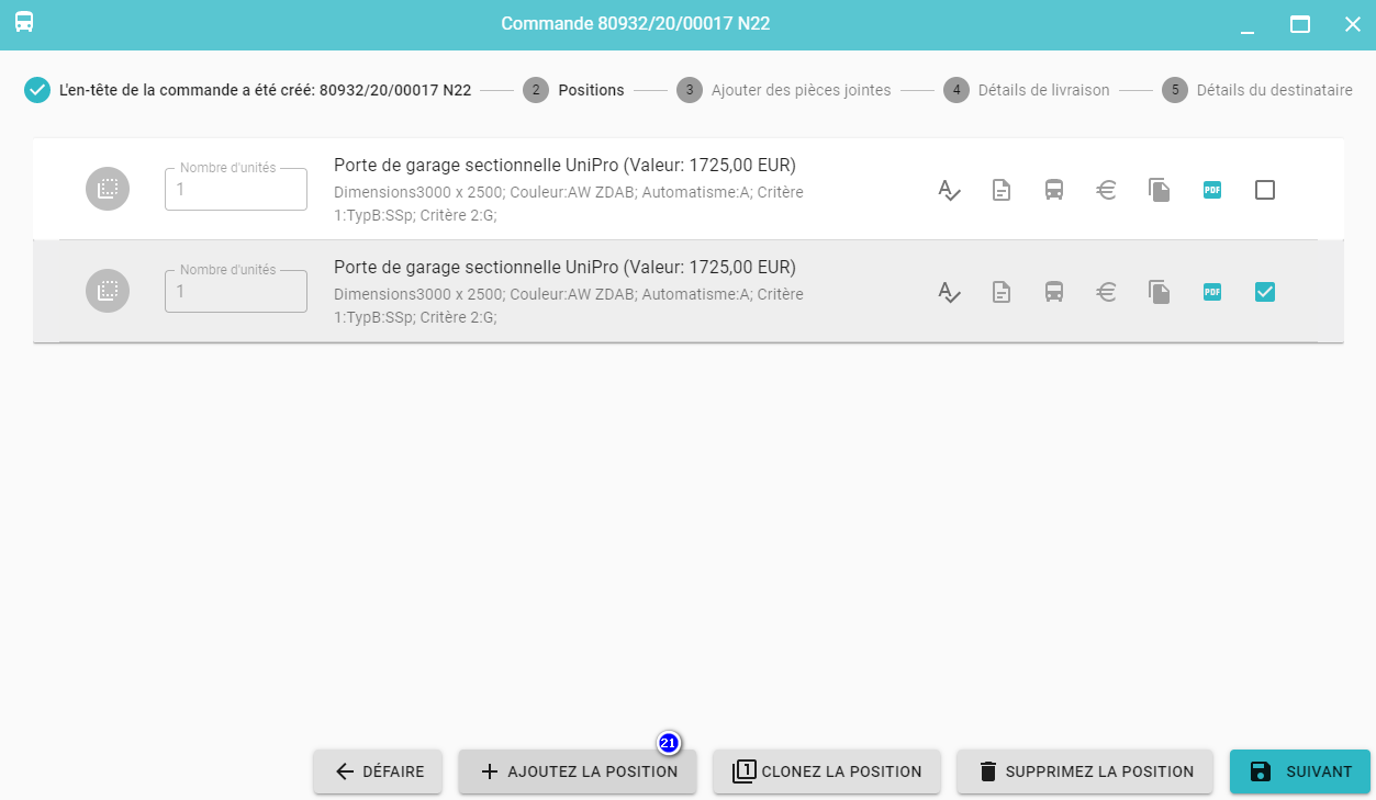 Les positions suivantes peuvent être ajoutées à la commande en cliquant sur le bouton Ajoutez la position (21).