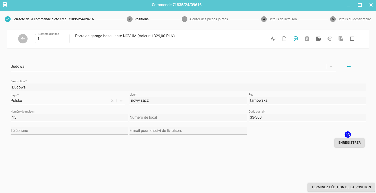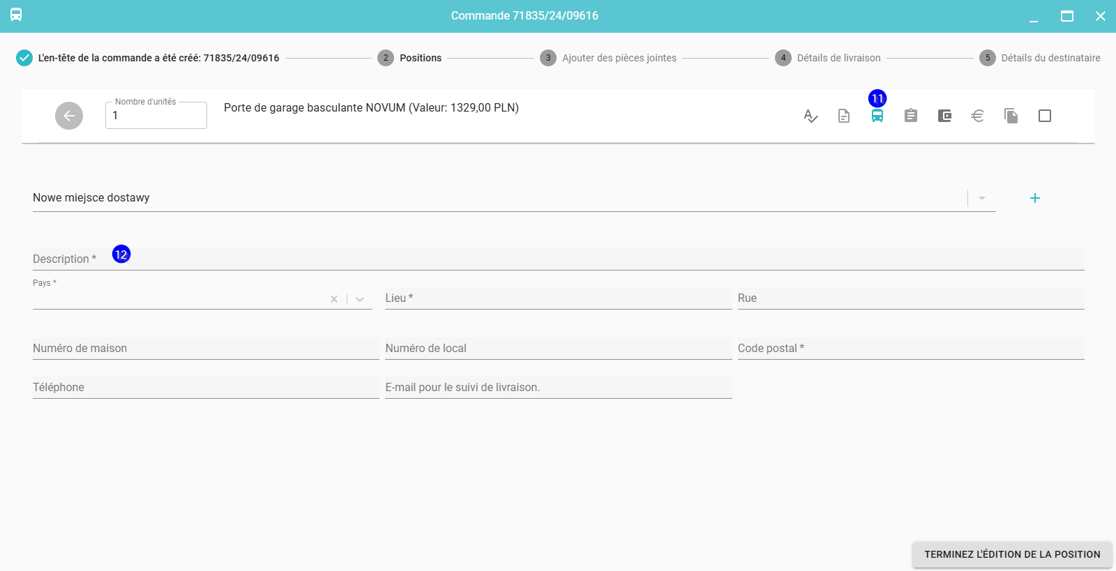 Cliquez sur Détails de livraison (11) - indiquez l'entrepôt de la liste (12) ou, dans le cas de la livraison sur le chantier, saisissez les détails de la livraison et cliquez Terminez l'édition de la position (13)