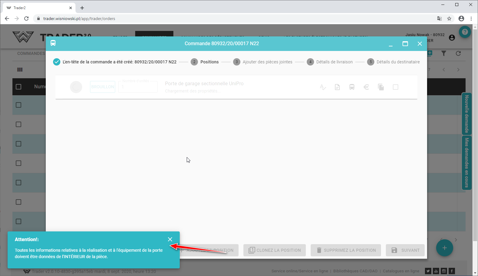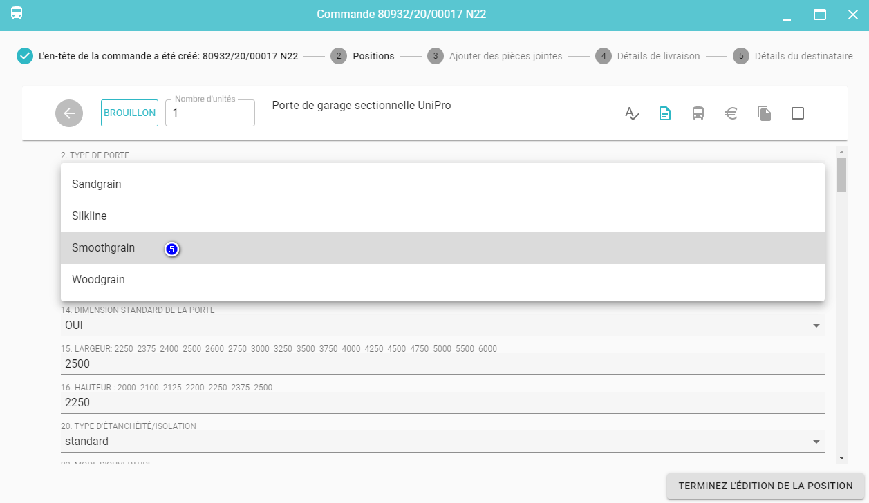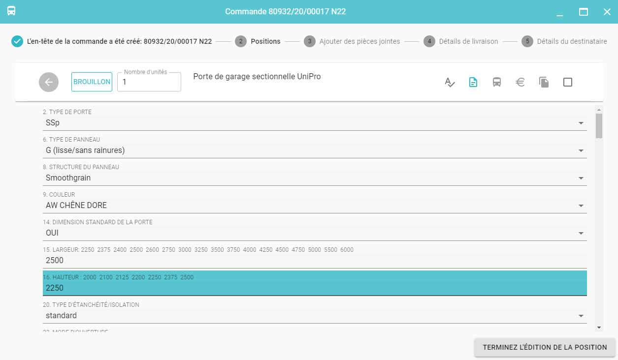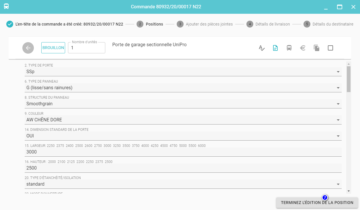 À ce moment, les propriétés sont enregistrées (8), le prix est calculé (9) (pour les portes sectionnelles, les conditions de pose sont également générées (10))