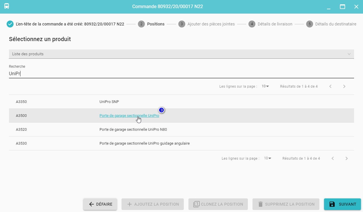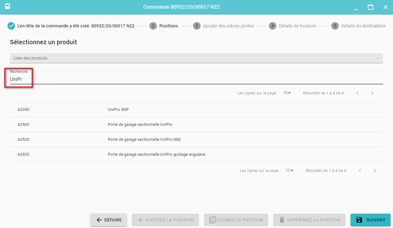 Une fois terminé Étape 1 - Création de l'en-tête de la commande vous allez à la liste des produits.