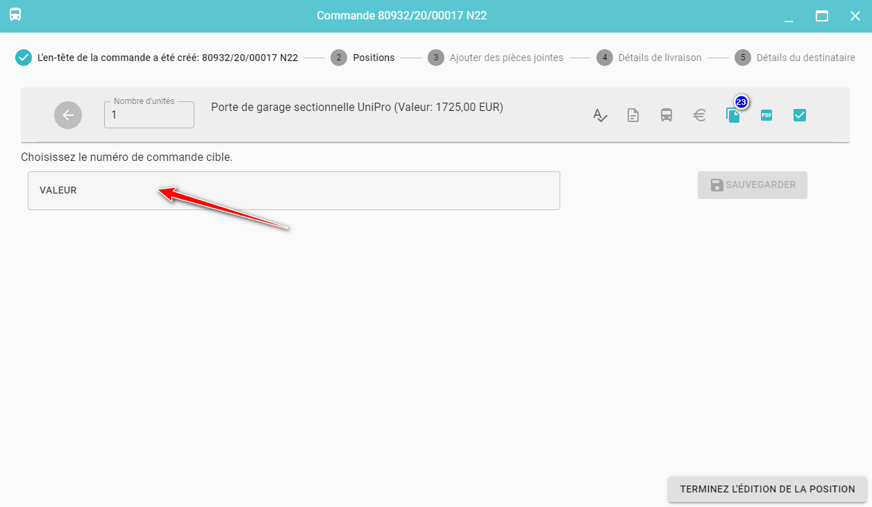 Il est également possible de copier la position ajoutée vers une autre commande en cliquant sur Copier à une autre commande(23) . Il faut ensuite saisir le numéro de la commande cible vers laquelle vous souhaitez copier la position, Sauvegarder et cliquer sur Terminez l'édition de la position.