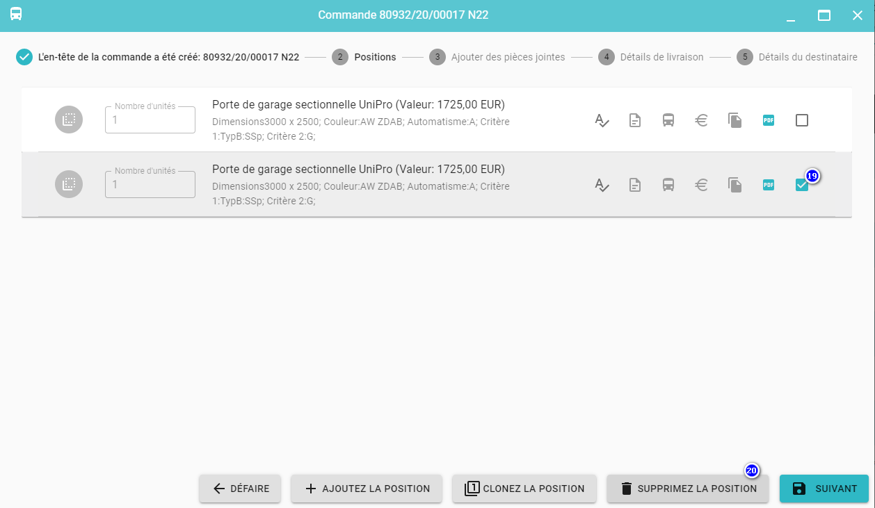 Il est possible de supprimer n'importe quelle position de la commande en la sélectionnant (19) et en cliquant sur Supprimez la position (20).