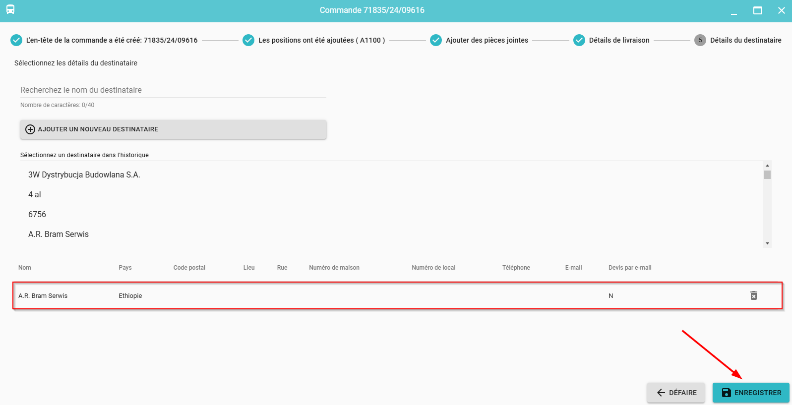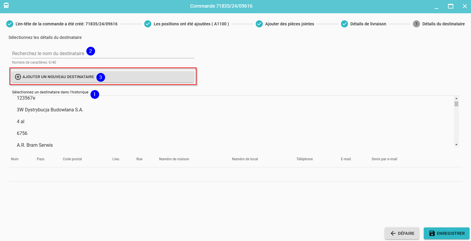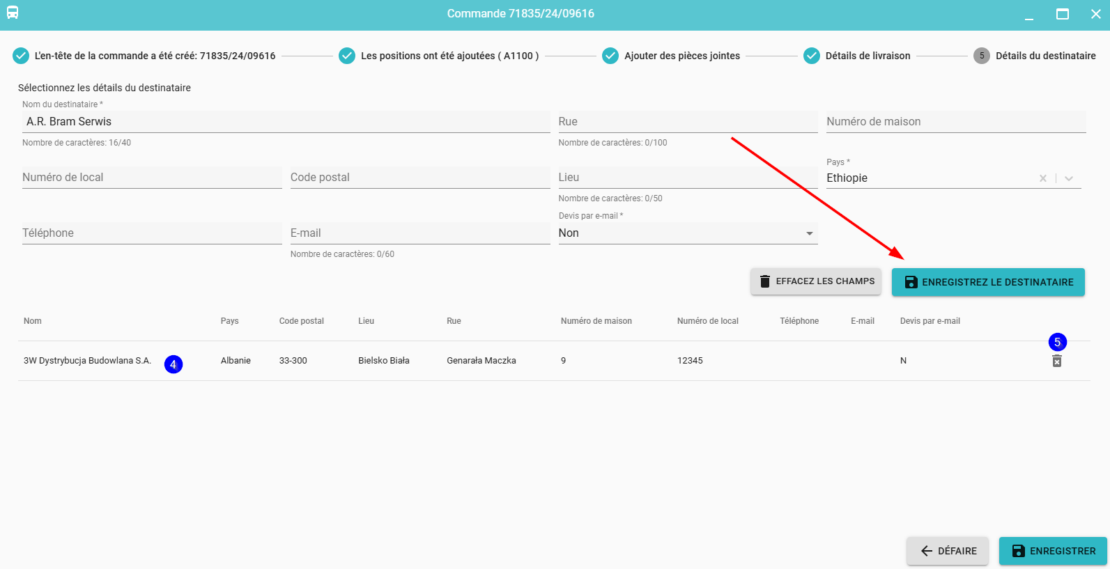 Si vous souhaitez supprimer un destinataire de la commande en cours, vous pouvez le faire en cliquant sur le bouton (5)
