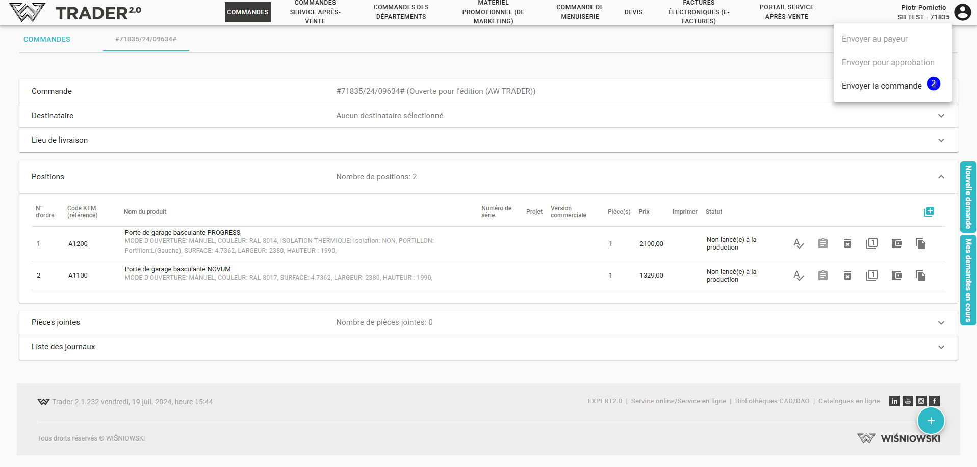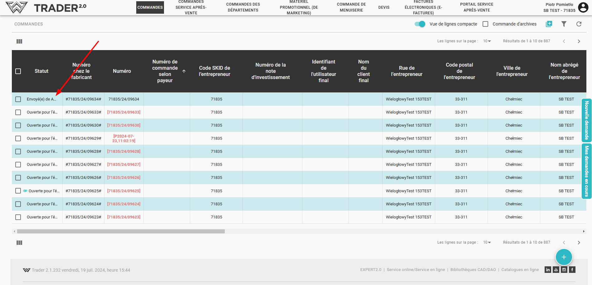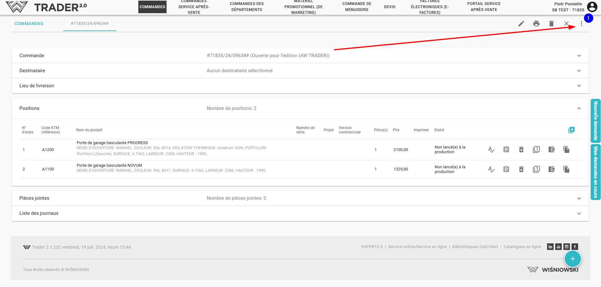 Pour envoyer une commande, veuillez ouvrir la commande et cliquer dans le coin supérieur droit sur l'icône de changement de statut (1).