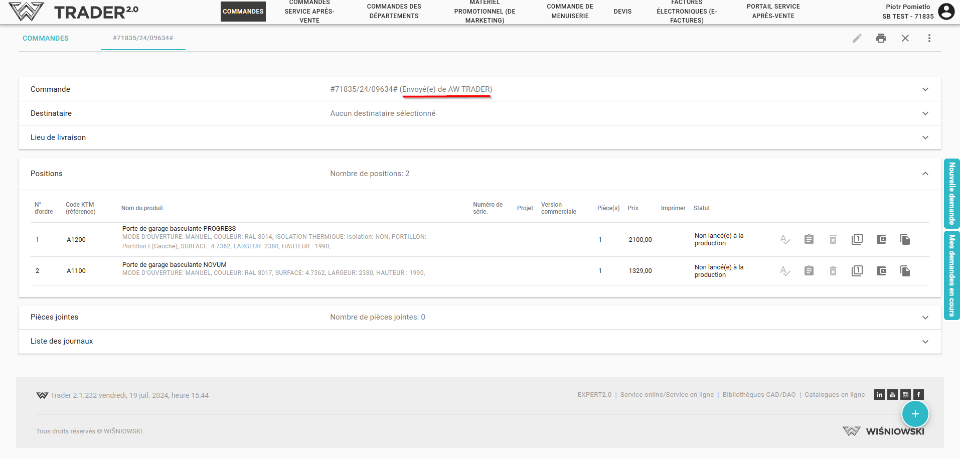 Après avoir rafraîchi la liste des commandes, le statut des commandes changera en Envoyée de AW TRADER.