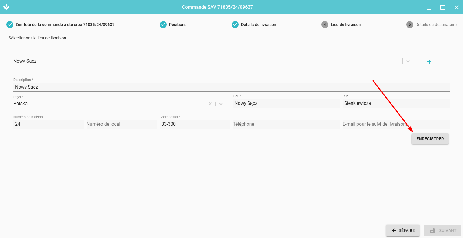 Dans l'étape suivante, nous pouvons compléter ou sélectionner à partir d'une liste le lieu de livraison (accepter en cliquant sur Enregistrer).