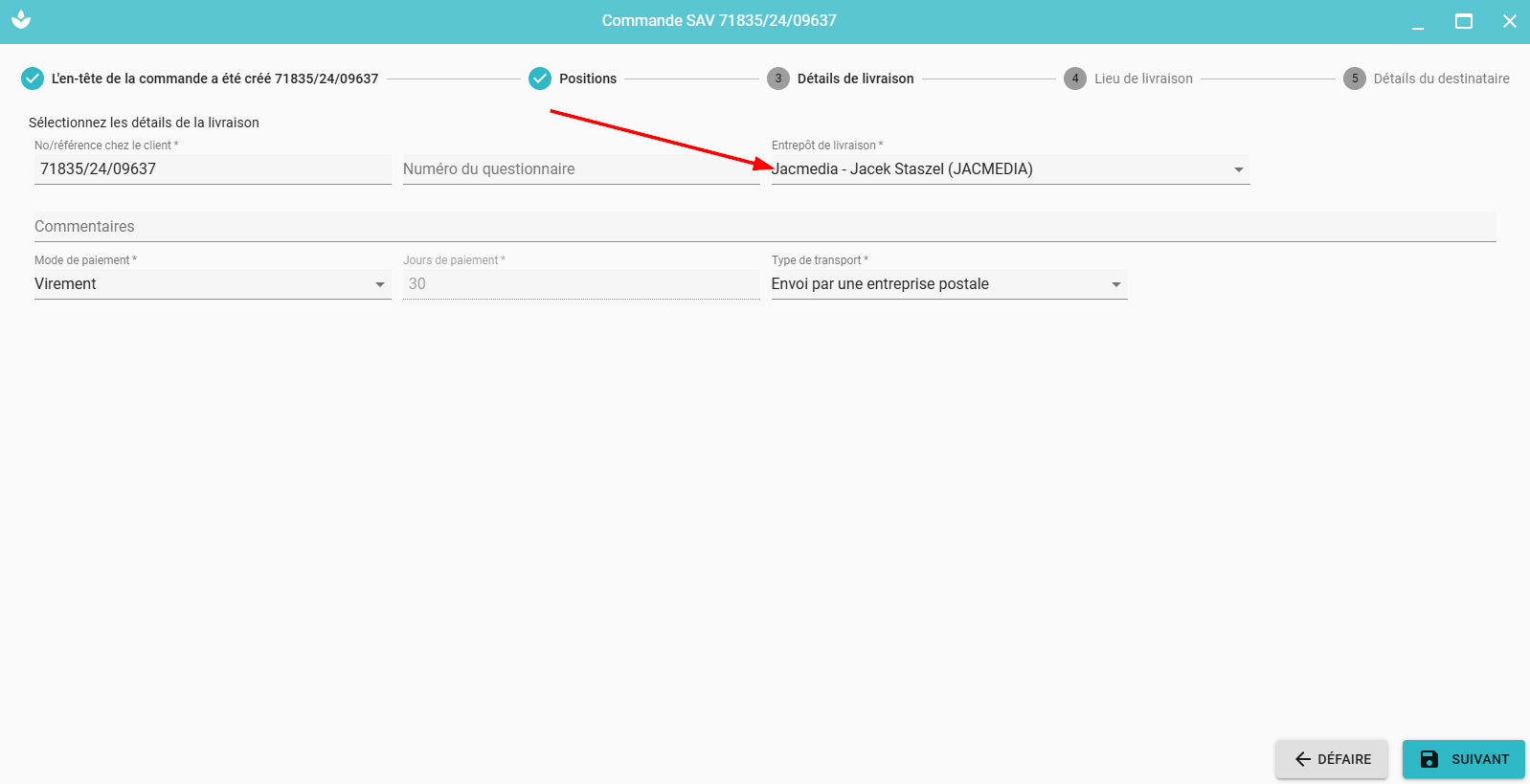 Dans l'étape suivante, nous pouvons sélectionner les détails de la livraison (la même action que dans l'onglet Détails de la livraison de la commande ).
