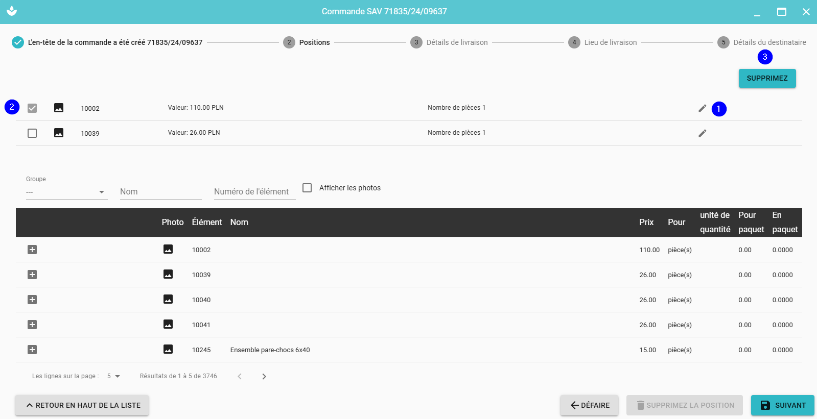 Il est possible de modifier (1) (nombre de pièces) ou, après avoir sélectionné (2) la possibilité de supprimer des éléments va apparaître (3).