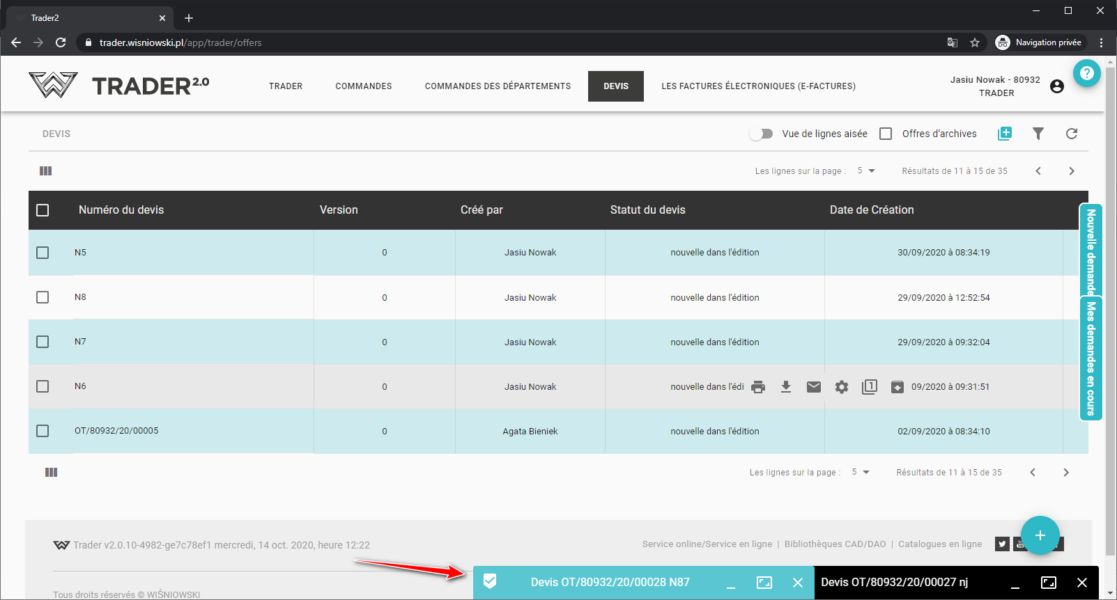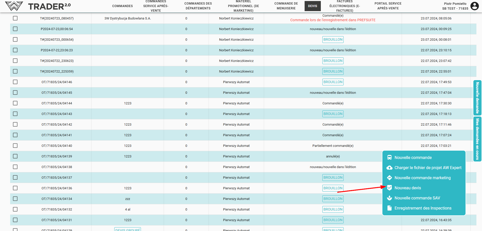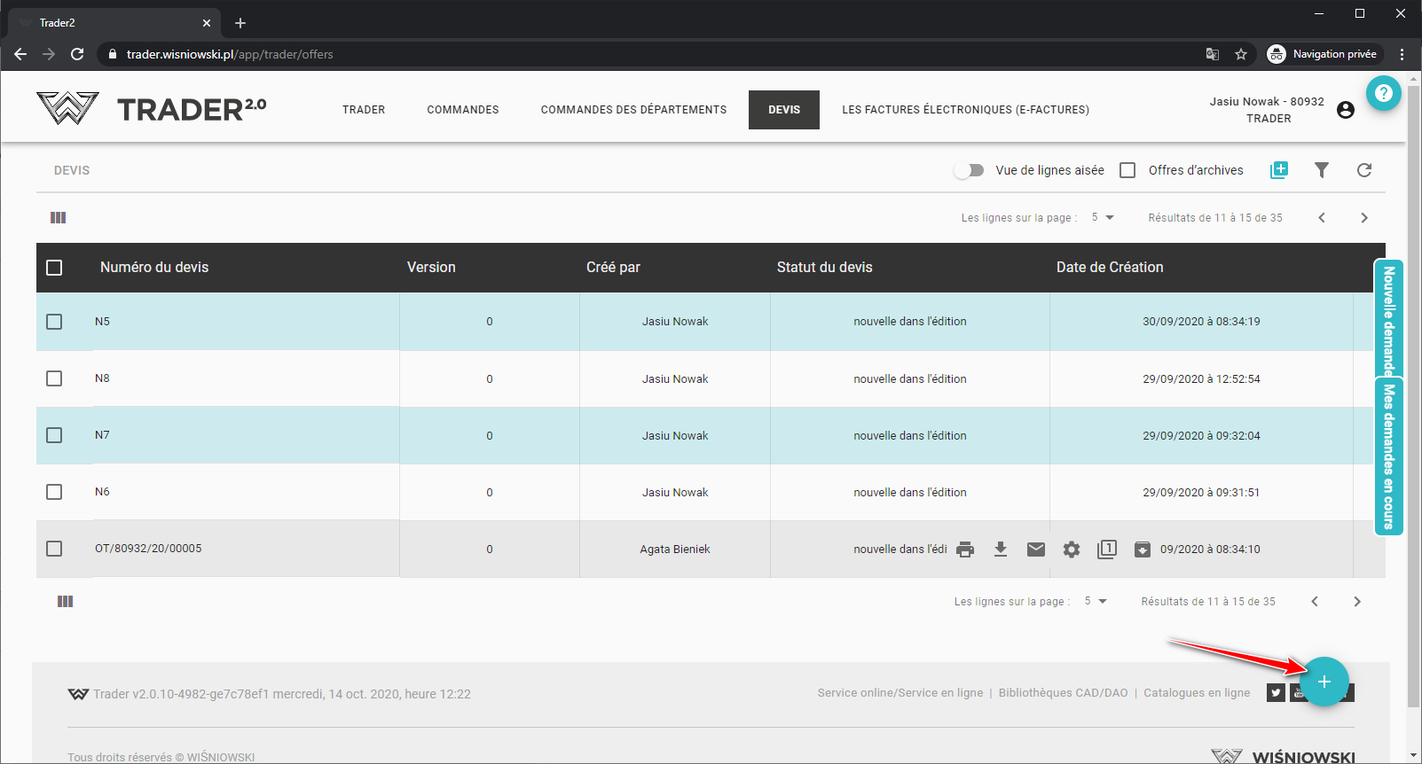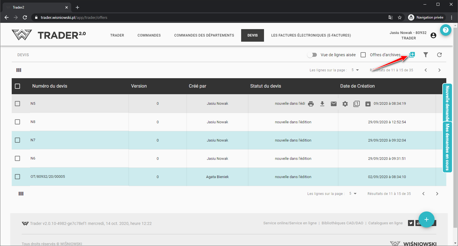 De plus, il est également possible de saisir un nouveau devis en utilisant le bouton , situé dans le coin supérieur droit, au-dessus de la liste de devis.