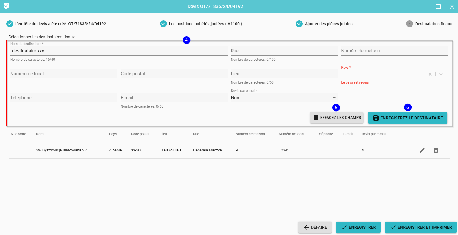 Dans cette étape, saisissez (ou sélectionnez dans la liste) les données du destinataire final - ces données sont visibles sur le document imprimé du devis/de l'offre. Si une commande est générée à partir de l'offre, il NE correspondra PAS à l'adresse de livraison de la commande !