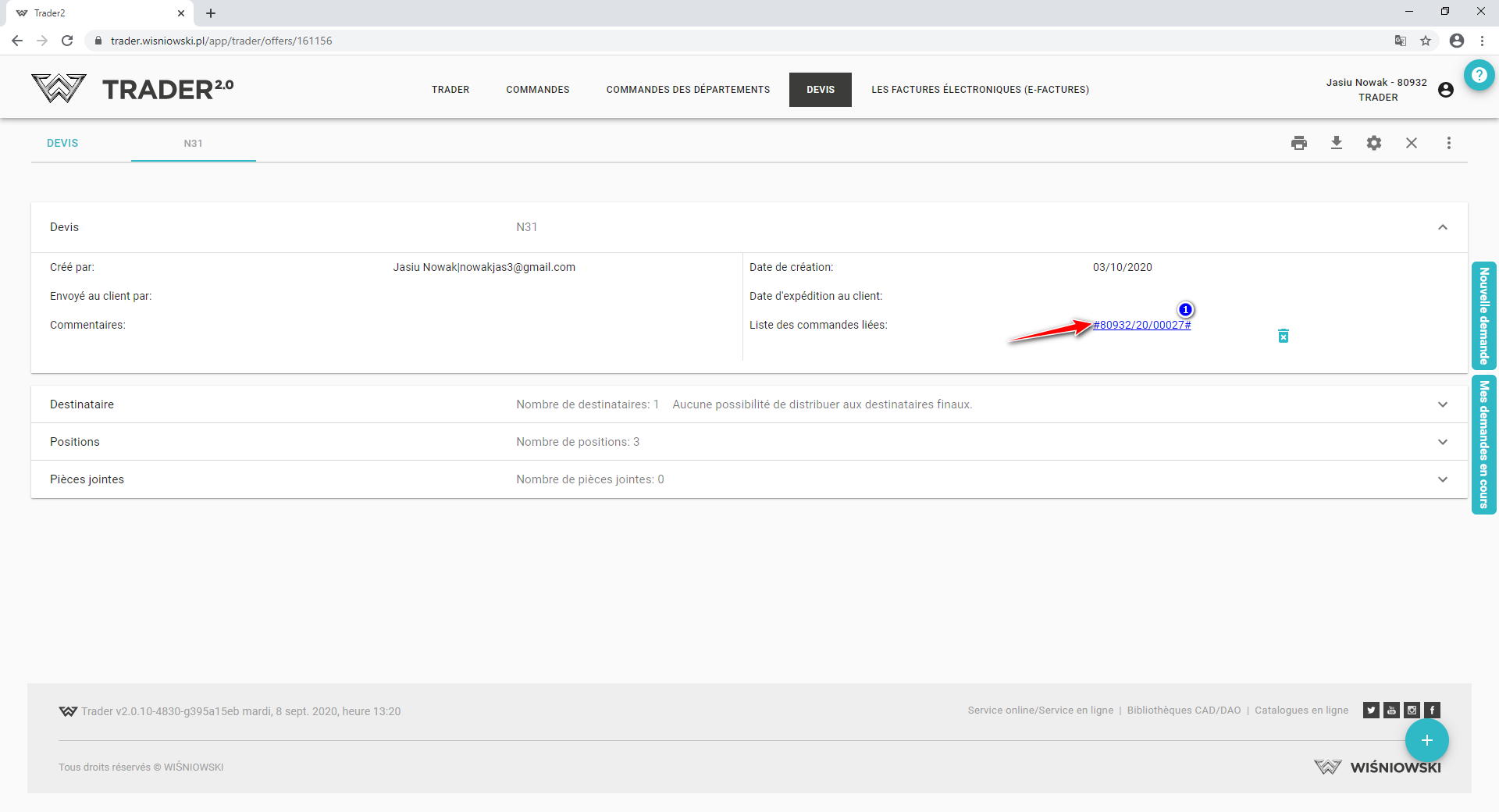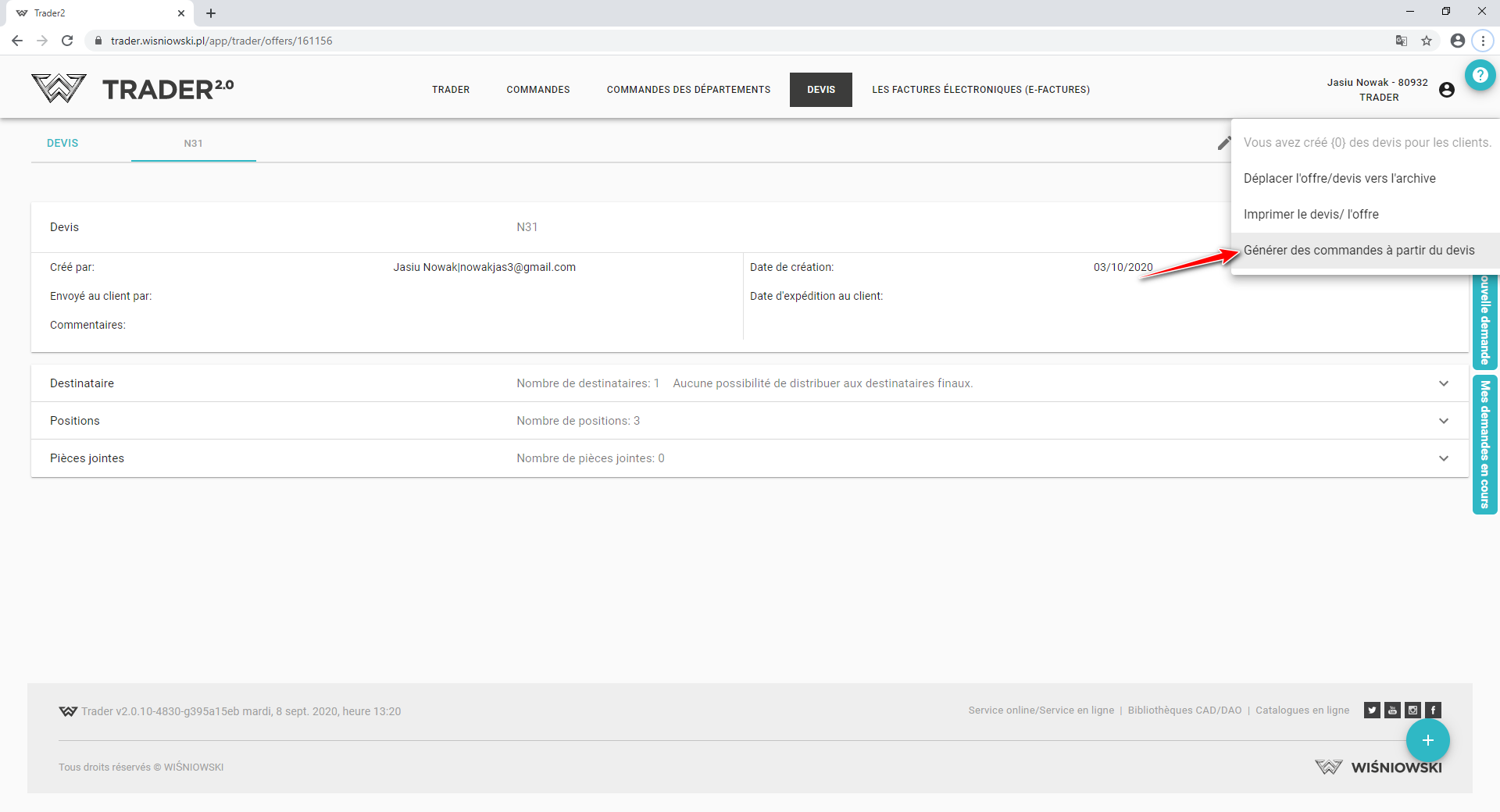 L'option Générer des commandes à partir du devis sera possible uniquement si un Destinatiare est ajouté et que le devis comporte au moins une position ajoutée (la position ne peut pas être en statut Brouillon ).