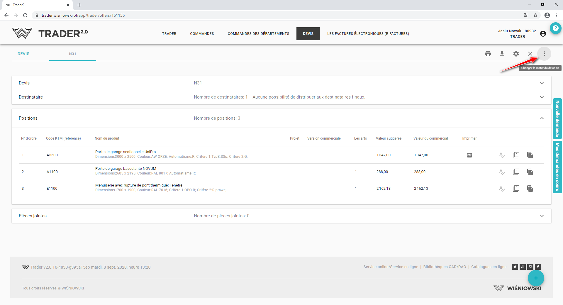 Afin de générer une commande à partir d'un devis, veuillez ouvrir le devis saisi et, dans le coin supérieur droit, cliquez sur l'icône de changement de statut.